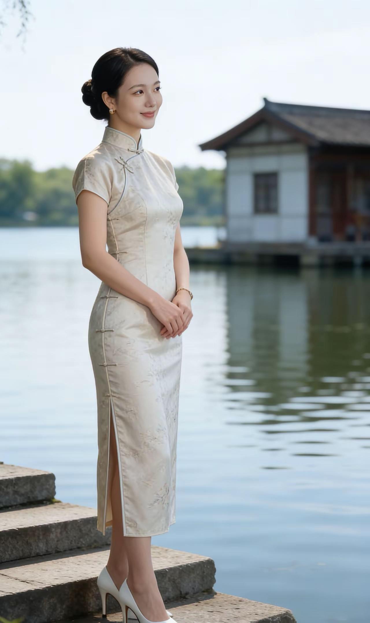 精致中式穿搭 白色立领连衣裙融合新中式韵味与现代简约,立领修饰颈部线条,泡泡袖增