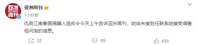 12月25日,亚洲周刊发文:仇英江南春画捐赠人庞叔令今天上午告诉亚洲周刊,她尚未接到任联系她接受调查组问询的信息。 目前事件的社会关注度太大,官方调查得需要时间,还是让子弹飞一会,事情总有水落石出的一天。 据了解,庞叔令是庞莱臣的曾孙女,父亲为庞增和。