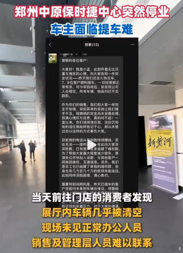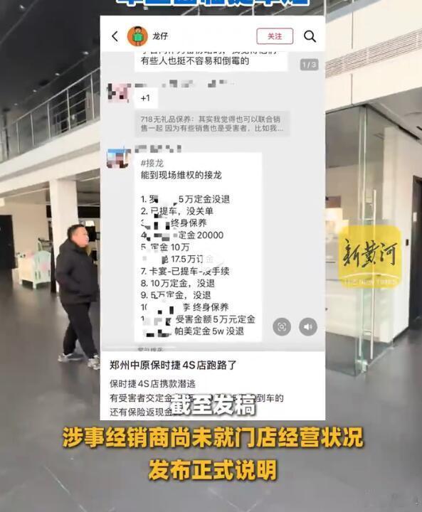 印象里,这好像不是进口豪车4S店第一次跑路了,之前好像还有个奔驰4S店的事情。目前的情况是,店内很多员工的工资未发,车主也无法提车,而有的已经提车的车主,还没有拿到车子的合格证,因为质押在银行那里。所以这事儿就很恶心了,没有合格证,车子就无法上牌,车主还得按时还车贷。而现在事情还没有下文,到底是资金链断裂,还是母公司跑路,都没什么说法,车主们已经准备开始维权了,我们也密切关注后续!郑州一保时捷中心突然闭店郑州中原保时捷中心突然停业