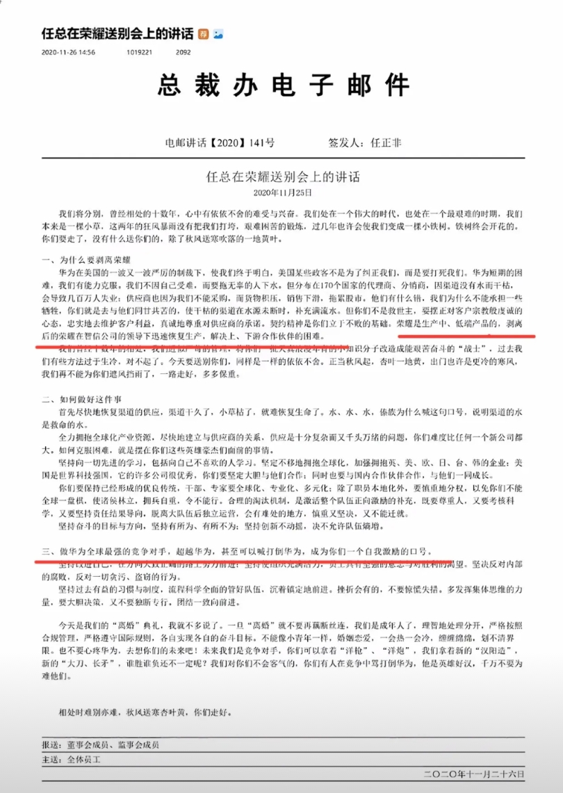 当初华为剥离荣耀 不是怕荣耀手机业务被制裁 竟然是为了拯救上、下游的合作伙伴,不得佩服任正非老爷子的格局,危难之际还先考虑别人,考虑合作伙伴的生死问题 难怪华为能一步一步从一个小公司走到今天,领头羊任正非的格局眼光都不是一般人,所以才带领华为走了这么远 任正非在荣耀送别会上的讲话稿,虽然话语简朴,但句句夯实有力,足以看得出任正非的眼光有多超前。