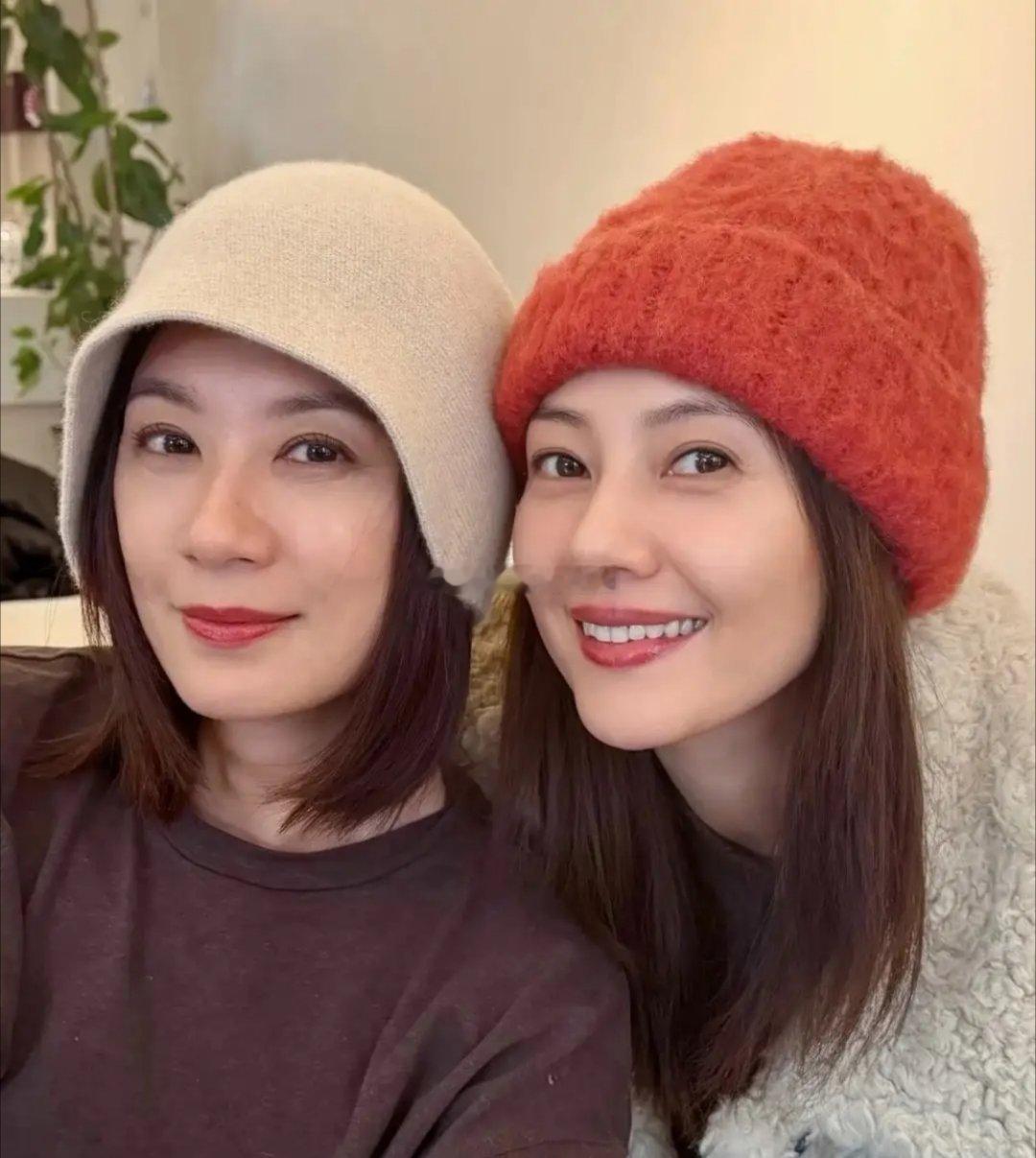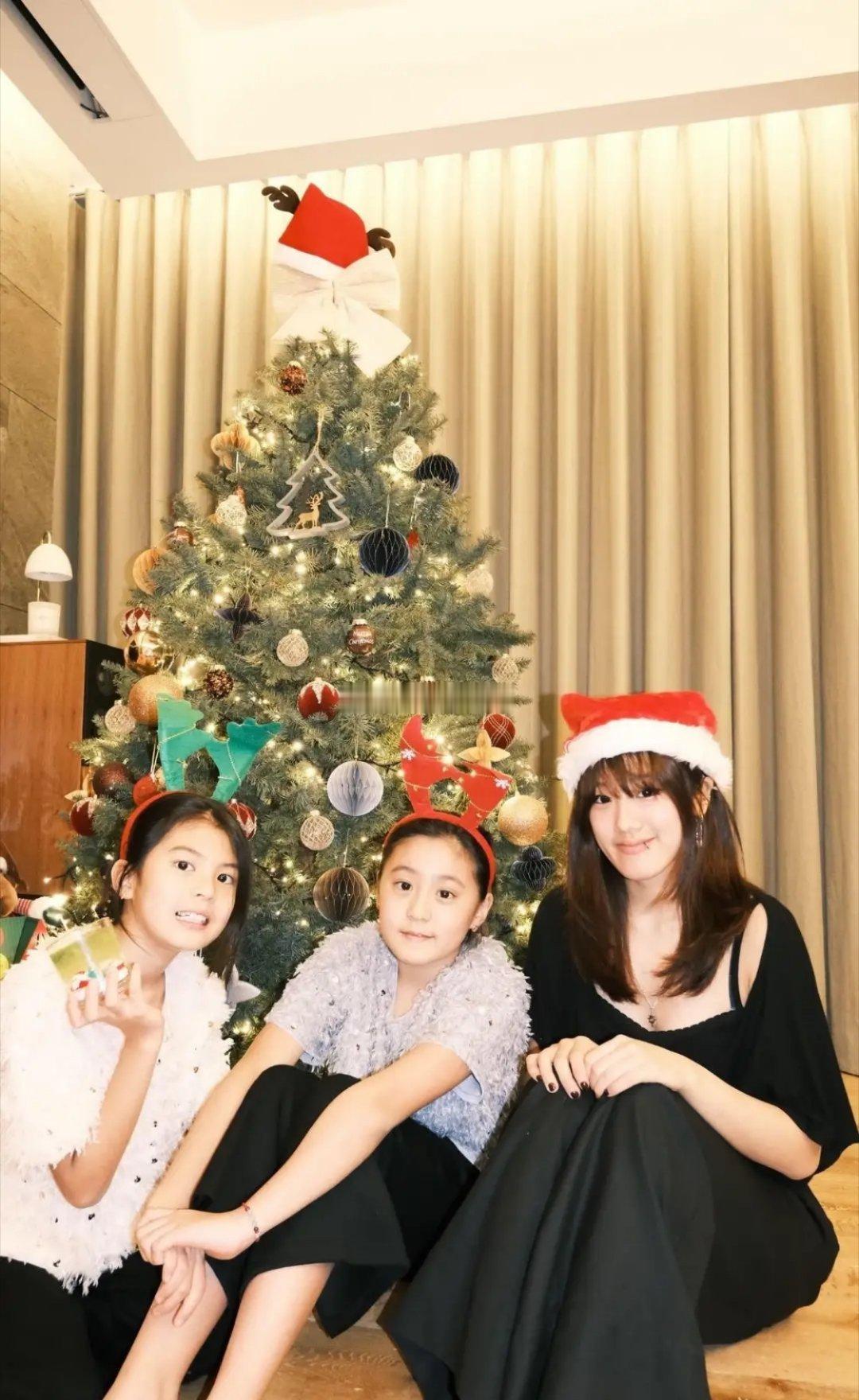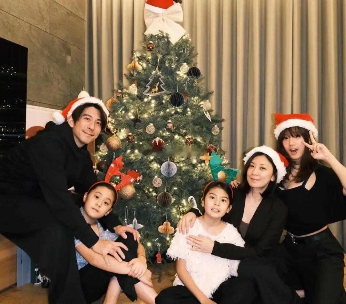 12月25日,贾静雯一家五口戴着圣诞帽在圣诞树前合影留念,画面温馨,尽显幸福。