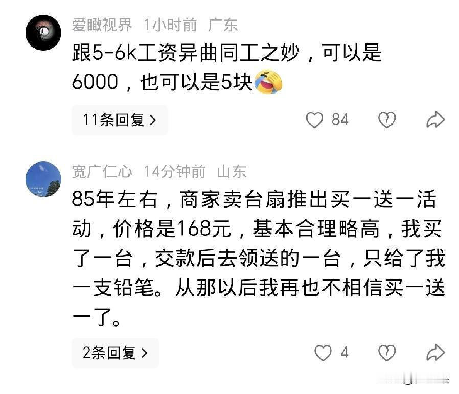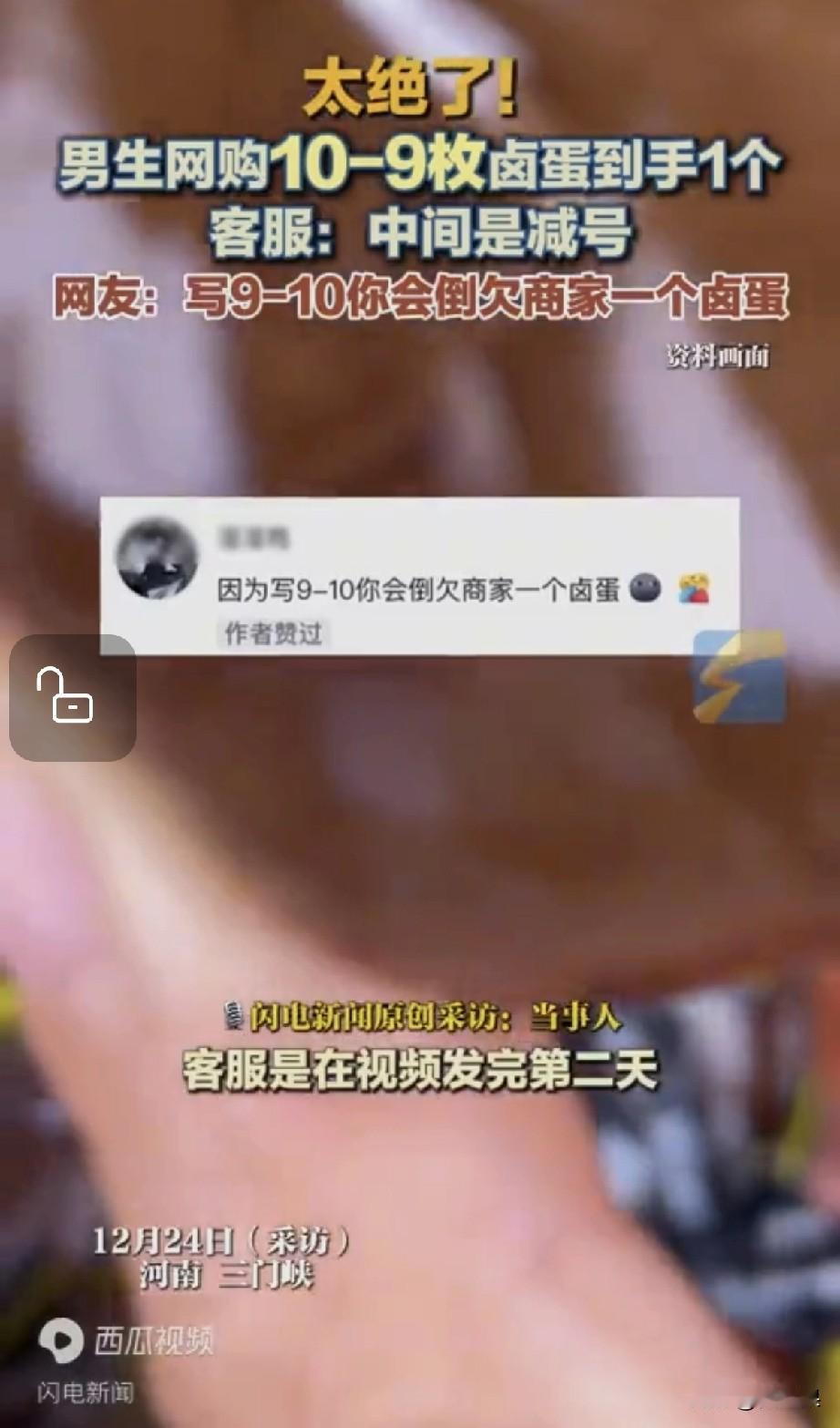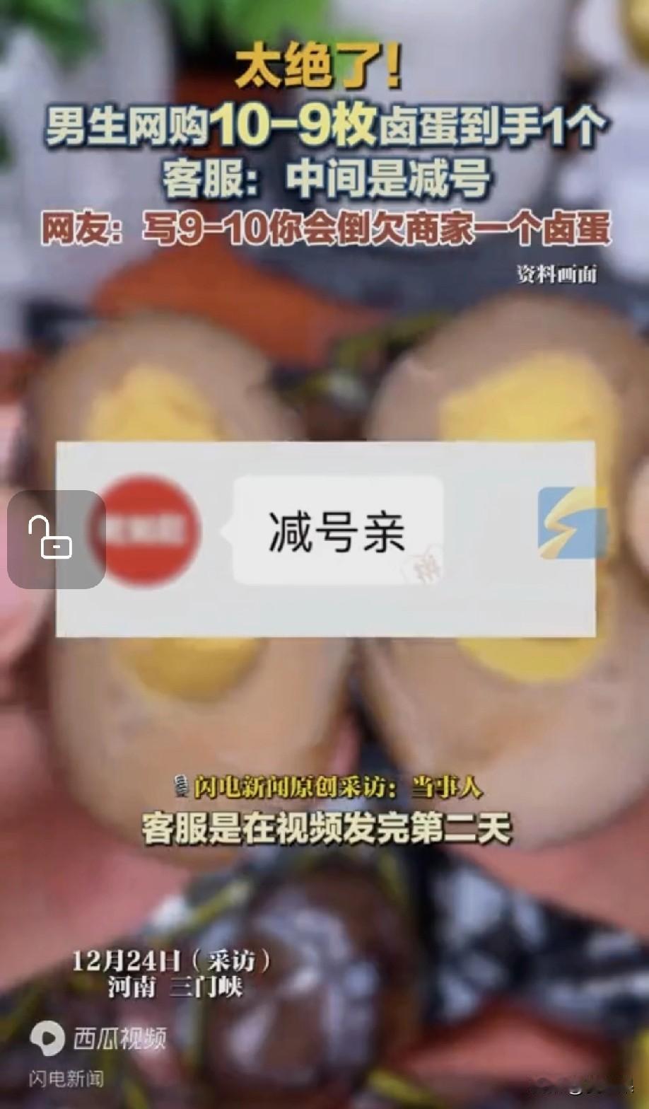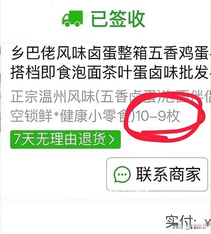 网购10-9枚卤蛋火了, 你以为是10枚,甚至可能是9枚, 因为你以为10到9, 其实都是你以为, 在商家眼里,那是减号,是10-9=1, 所以到手里只能是1枚。 好比买一送一,送的那个一可不一定就是买的那个一, 好比5-8k月薪,可不是5000-8000,还有5块,6块,100块,都含在其中。 只能说现在套路太深。