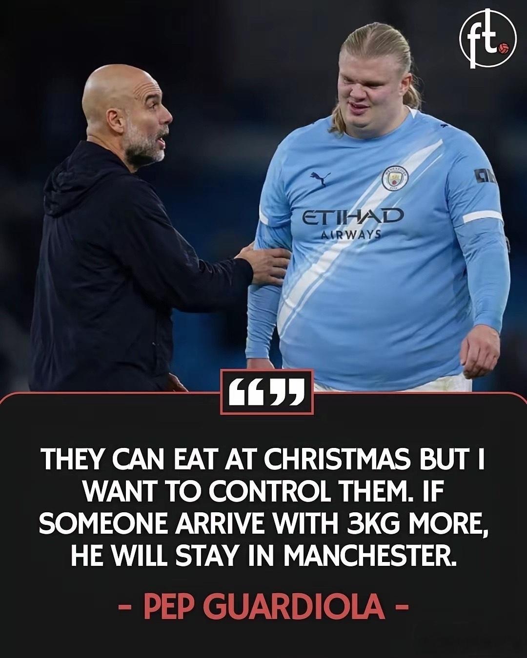 瓜迪奥拉希望他的球员们今年圣诞节不要吃裹着培根的香肠:12月25日我会到现场亲自称重,如果有人体重超标三公斤,他就得留在曼彻斯特加练,不能去诺丁汉森林踢客场!!!当年梅西喜欢喝可乐,也是被瓜迪奥拉严令禁止并修改菜单,结果逼出了身体最强梅西足球圣诞节