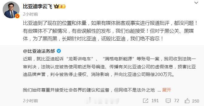比亚迪起诉自媒体“龙哥讲电车”一审申诉,获赔200万元法院认定被告使用前述账号编造、传播有关比亚迪公司的虚假信息,损害比亚迪商业信誉及商品声誉,判令被告停止侵权、消除影响,并向比亚迪公司赔偿 200 万元。比亚迪公关处经理李云飞也转发微博发表观点。比亚迪起诉龙哥讲电车等获赔200万