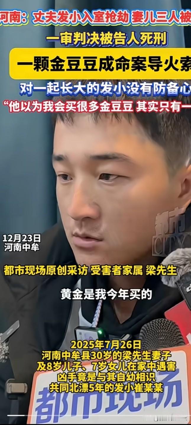 一颗金豆豆成灭门案导火索,凶手被判死刑,公证员称,只见几面就发现这人没有共情能力,而被害人丈夫梁某却拿他当兄弟对待。 12月23日上午,郑州中级人民法院依法公开审理崔路路抢劫杀人案,并当庭宣判崔路路死刑,崔路路表示不上诉。 当崔路路被法警带上法庭时,他环顾一圈,眼神空洞,在与梁某眼神相撞时,梁某某狠狠的瞪了他一眼,跳过桌子想上前打他,想质问,你拿起刀的那一刻,没有一点恻隐之心吗?被人拦住。 自从2025年7月26日,30岁的妻子,8岁的儿子和7岁的女儿被发小杀害,他是悔恨不已,他怎么也没想到,那个他总是借钱帮助,请回家吃饭,带上打工的发小能残忍的向他的妻儿挥起了屠刀。 梁某某回想崔路路的作案动机,源于一颗金豆豆。案发前,梁某某与崔路路一块取快递,他无意透露买的是金豆豆,并告诉崔路路也可以买,涨了就卖,跌了就给妻子打首饰。 梁某某说,崔路路以为他买了许多,其实他的经济也不宽裕,也只买了一颗。之前他也催崔路路还借的钱,崔路路称手头紧,缓些日子,于是将主意打在他家身上。 崔路路是早已起心,不知啥时配了他家钥匙,晚上两点进入家中翻箱倒柜,惊动梁某的妻子,妻子反击,孩子也醒了,崔路路将将母子三人杀害,摘下梁某妻子手上的金手镯,打扫干净现场后逃脱,装得像什么也没发生一样,照样接听梁某的电话。 法院公证员对梁某说,只是见了崔路路几面,就觉得此人没有共情能力。 即使证据确凿,崔路路还在法庭上做垂死挣扎,当场翻供,说是自己半夜出来偷电动车,搬不动,上门让梁某妻子帮忙,就发现母子三人己经死亡了,𠄘认打扫了现场,撒谎逻辑荒唐至极。 我觉得吧,梁某引狼入室,圣母心更可恨,别人是不知根底防不胜防,他是明明知道崔路路从小偷鸡摸狗,偷遍全村,人人避之,每天拆东墙补西墙,甚至自家被偷过3万元,也怀疑过他,还将他打过一顿,只是他没𠄘认,梁某某却与他处成兄弟,经常请他回家吃饭,有借必给,走哪都带着他,不坑他坑谁? 害人之心不可有,防人之心不可无。一个品行坏的人,他的人生观,价值观已经偏离了轨道,仁慈救赎不了,情义打动不了,还拿你当傻瓜。正如那位公证员所说的,仅仅接触几次,就知道崔路路没有共情能力。一个人的坏其实是藏不住的,可以从言行表情中体现出来,只是很多人忽略了,以为是感情升华之后的随性。 交友要慎,财不外露,钱不乱借,看似保财,实则是保命,一步走错,后悔都迟了。