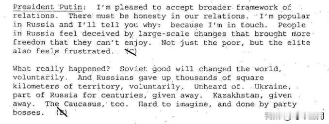 根据一份新近公布的会晤备忘录,普京在2001年6月与美国总统乔治·W·布什的会晤中暗示,俄罗斯未来或许会加入北约。 他表示,在北约扩张的背景下,俄罗斯“感到被冷落”,并指出苏联曾在1954年申请加入北约。 普京认为,当年被拒绝的理由如今已不再适用,并提议“俄罗斯或许可以成为盟友”,强调俄罗斯“和美国一样,是欧洲多民族国家”。