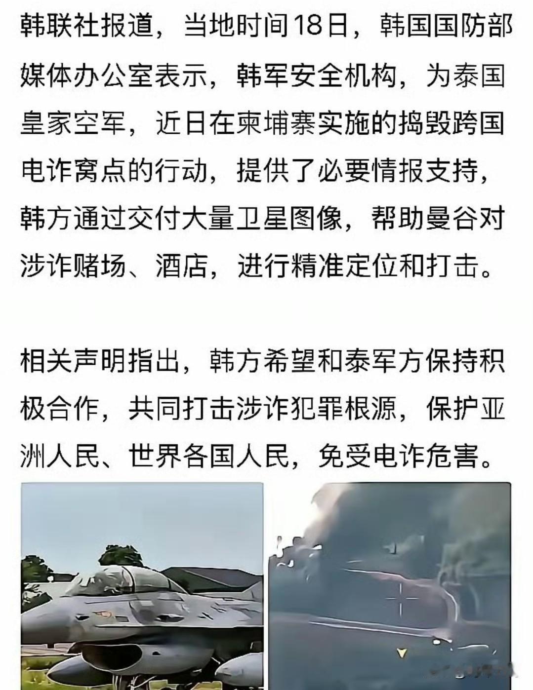 韩国为泰国空袭柬埔寨提供了情报支持! 韩国军方日前表示,韩军为泰国皇家空军提供必要情报支持,帮助泰国对涉及电子测园区、赌场、酒店实施了精准定位和打击。 韩国军方表示,将继续与泰国军方合作,共同打击电诈根源,保护亚洲人民,免受电诈侵害。