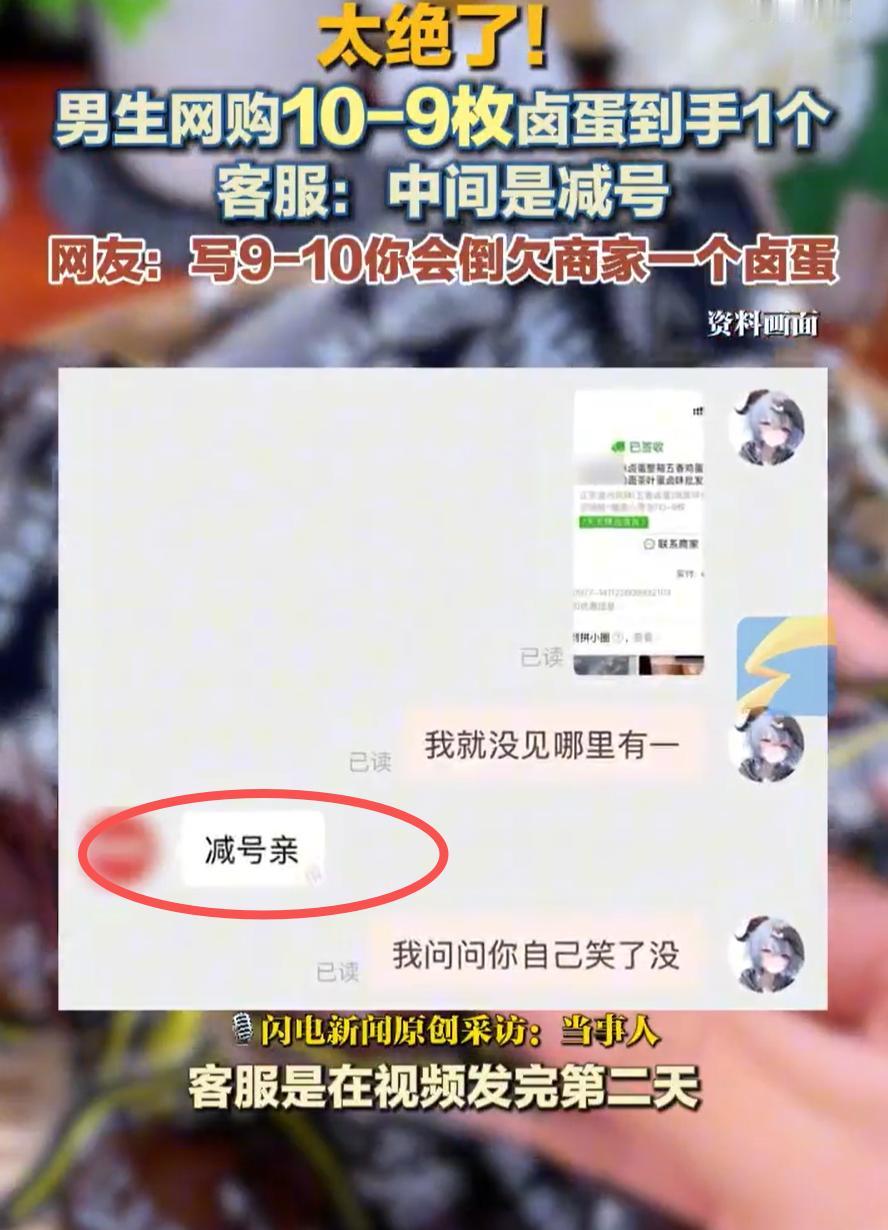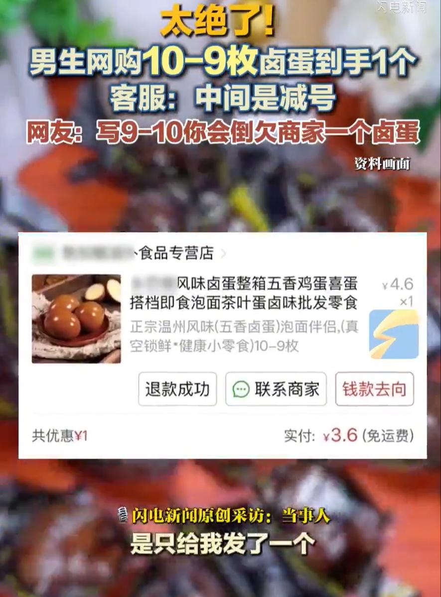 被气笑了!河南三门峡,男生网购时看到有卖卤蛋的很划算,10-9枚卤蛋到手只要3.6元,男生立刻下单,可到手后只收到1枚,询问商家对方却表示这不是10到9枚卤蛋的意思,而是10减9的意思,所以一枚卤蛋没毛病,男生当场就被这个解释给气笑了 起初,男生去收货时就发现了不对劲,按理来说,10枚卤蛋不算少,起码也要一个小箱子才能装得下,可他收到的快递,却是一个超迷你的箱子,这怎么看都不对劲 到家后,他发现里面就只有一枚卤蛋,还以为是商家发错了,可找到客服,对方却表示没发错,他拍的链接就是一枚卤蛋,中间的“-”是减号 男生气不过,就把这个事发到了网上,没想到却意外的火了,而商家在第二天就主动联系他退了10倍价格,最终赔付了36元 对此,有网友调侃说:商家挺仁义,起码没给你写9-10,不然你还得欠人家一个蛋 还有网友说:我买了一卷100米的的双面胶带,到手只有5.4米,问客服,客服让我拿尺子量,然后就拍视频用尺子量,量完了客服回答说100米只是大概米数,有误差。实际上没有那么精确,当时我就笑了 其实这类“标题游戏”在电商平台并不新鲜。用符号玩花样、打模糊表述的擦边球,本质是利用消费者惯性思维和快速浏览的习惯。我们看商品标题时,大脑往往自动过滤掉非常规符号,直接抓取关键数字和产品名,可恰恰这时就容易吃哑巴亏 买一箱水果收到一小盒,标“5-10斤”的零食到手永远是最低值,问就是“区间重量,随机发货”。这肯定是不行的 我觉得,平台监管需要更细致,对这种利用标点、格式误导消费者的行为应有明确界定和处罚。但作为普通买家,我们也能多留个心眼,下单前仔细看描述,特别是那些带符号、数字区间的产品,详情页里往往藏着真实信息