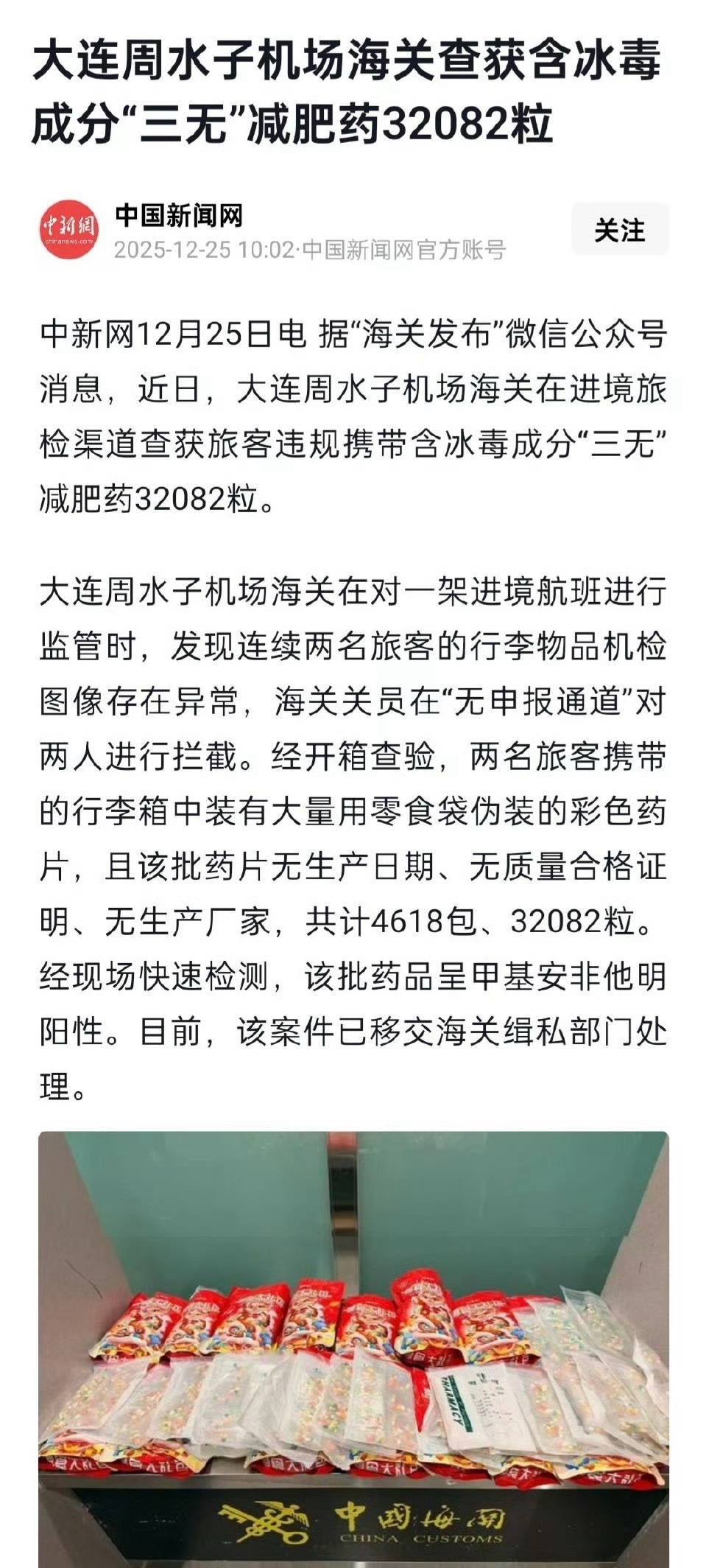 2人带30000多粒含冰毒减肥药入境大连海关查获冰毒成分减肥药,共计4618包32082粒。。。