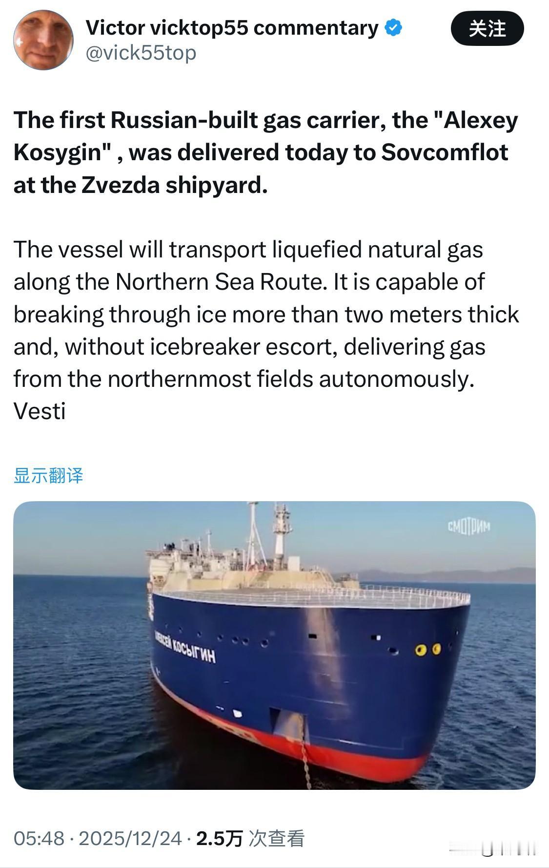 今天,俄罗斯建造的第一艘破冰级天然气运输船“阿列克谢·柯西金”号(Alexey Kosygin)在红星造船厂(Zvezda)交付给俄罗斯航运公司(Sovcomflot)。 该船将沿北方海路运输液化天然气。它能够破开超过两米厚的冰层,并且无需破冰船护航,即可自主地从最北端的气田运送天然气。 它是Zvezda造船厂计划建造的15艘Arc7级别LNG运输船中的第一艘,Sovcomflot预计明年还将接收两艘同级船只。