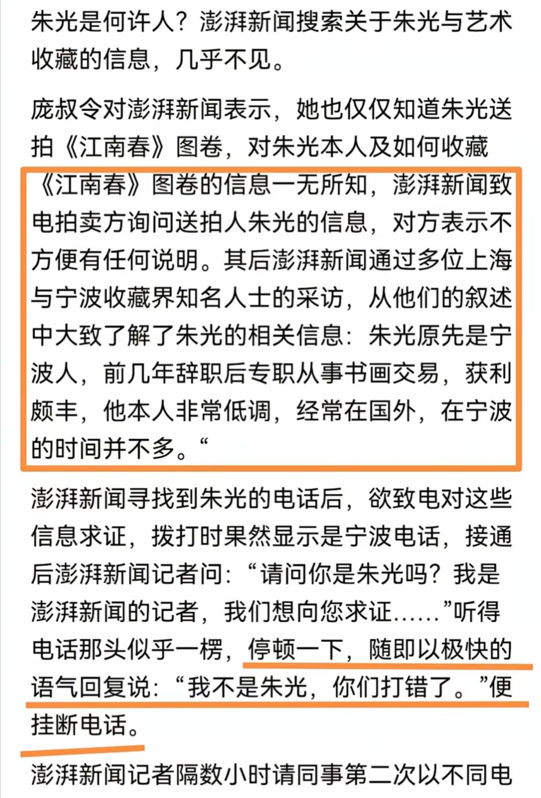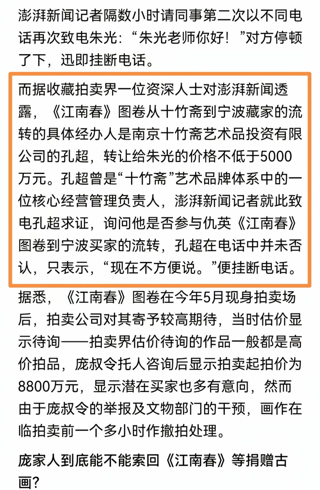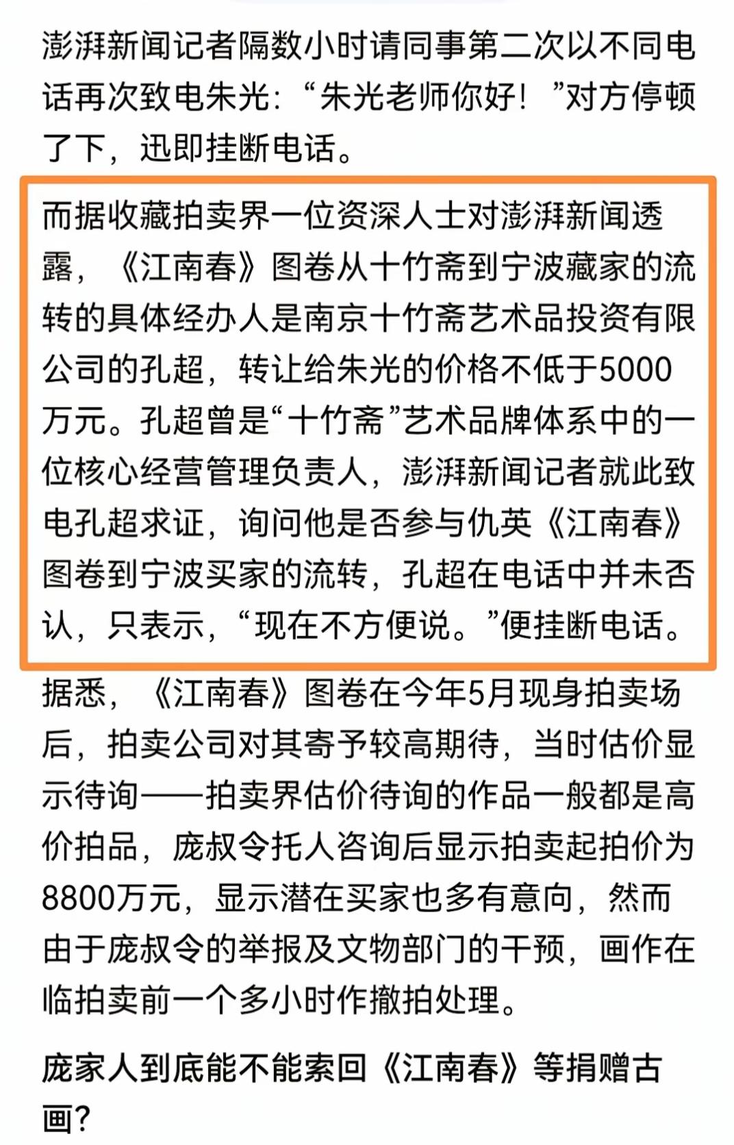 今天就把南博的《江南春》画的始末好好的说完整。 1959年庞莱臣后人捐赠137幅古画。 1961/1964两年认定五幅画为仿品,其中就有《江南春》 到了九十年代,《江南春》被踢出收藏品,流转到江苏博物总店。当时南博和博物商店法人都是当时院长。 2001年,被以仿画出售6800元给无名氏。 2025年在北京拍卖起价8800万。而卖画人是浙江商人朱光。 他是在南京十竹斋打包(多幅)价5500万购买。 十竹斋的这批画的来历更是蹊跷。可以看图文,是媒体调研来的。 南京十竹斋也是成分复杂的国营。 真相比小说都难构思,就这弯弯绕,不是网络铺天盖地的拼图证据,罪犯还真不容易落网。 这样的真相,会是怎样的结局? 新凤霞后人捐赠古董的后果,也是60几件不了了之。只能希望以后不再丢失,出册认定。 听着好无奈。真希望能像网络爽文一样有解气的结局。