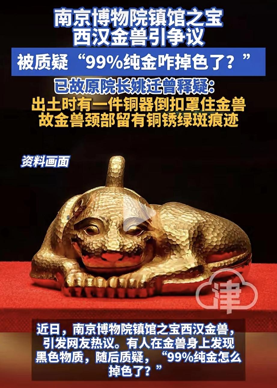南京博物院的西汉金兽居然“掉色”了?! 这可是镇馆之宝,纯度快到99%的纯金兽,咋还能看出黑印子和绿斑呢? 已故的南博原院长姚迁早就解释过这事,这根本不是金子掉色,是出土时的小插曲闹的。当年金兽被挖出来时,上头扣着个铜器,埋在地下两千多年,铜锈就蹭到金兽脖子上,留下了绿斑,那些黑色痕迹也是千年埋藏里沾的杂质,跟金子本身没关系。 纯金的化学性质多稳定啊,哪能随便掉色。只能说网友们看得细,也难怪大家紧张毕竟最近南京博物馆出了那么多事情。