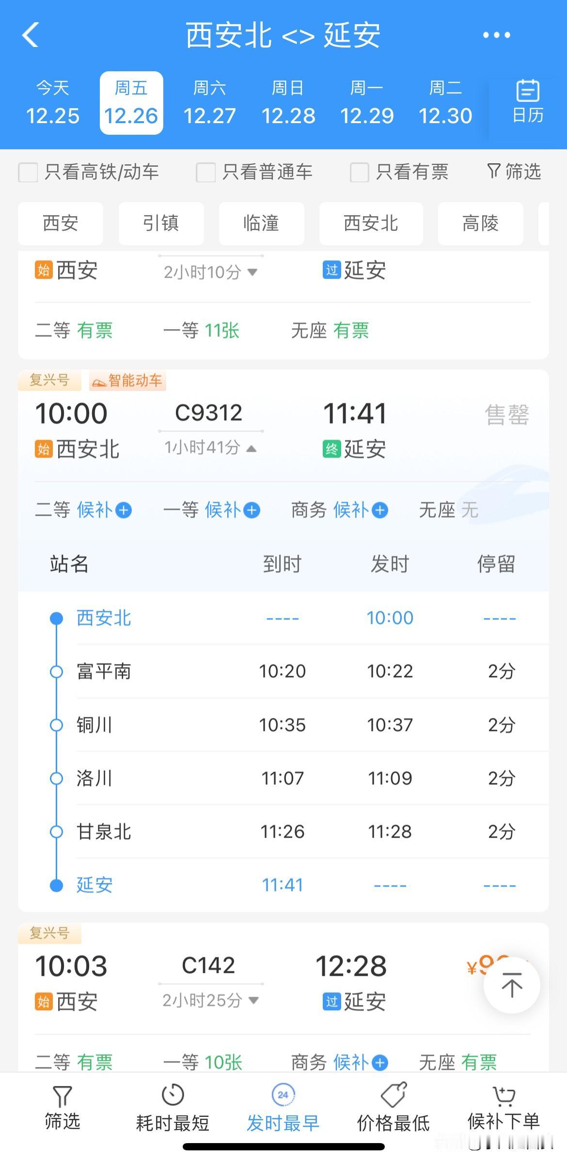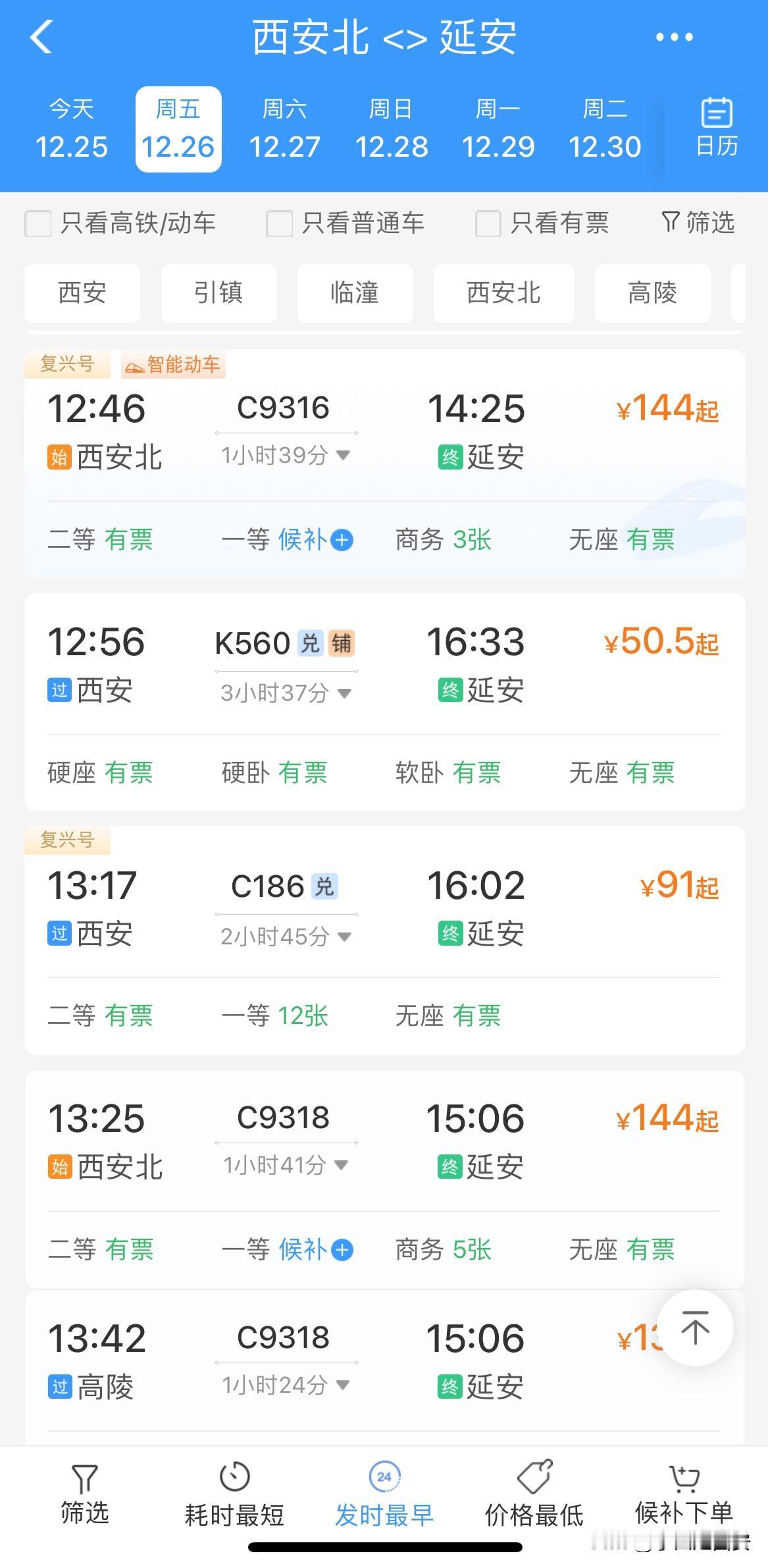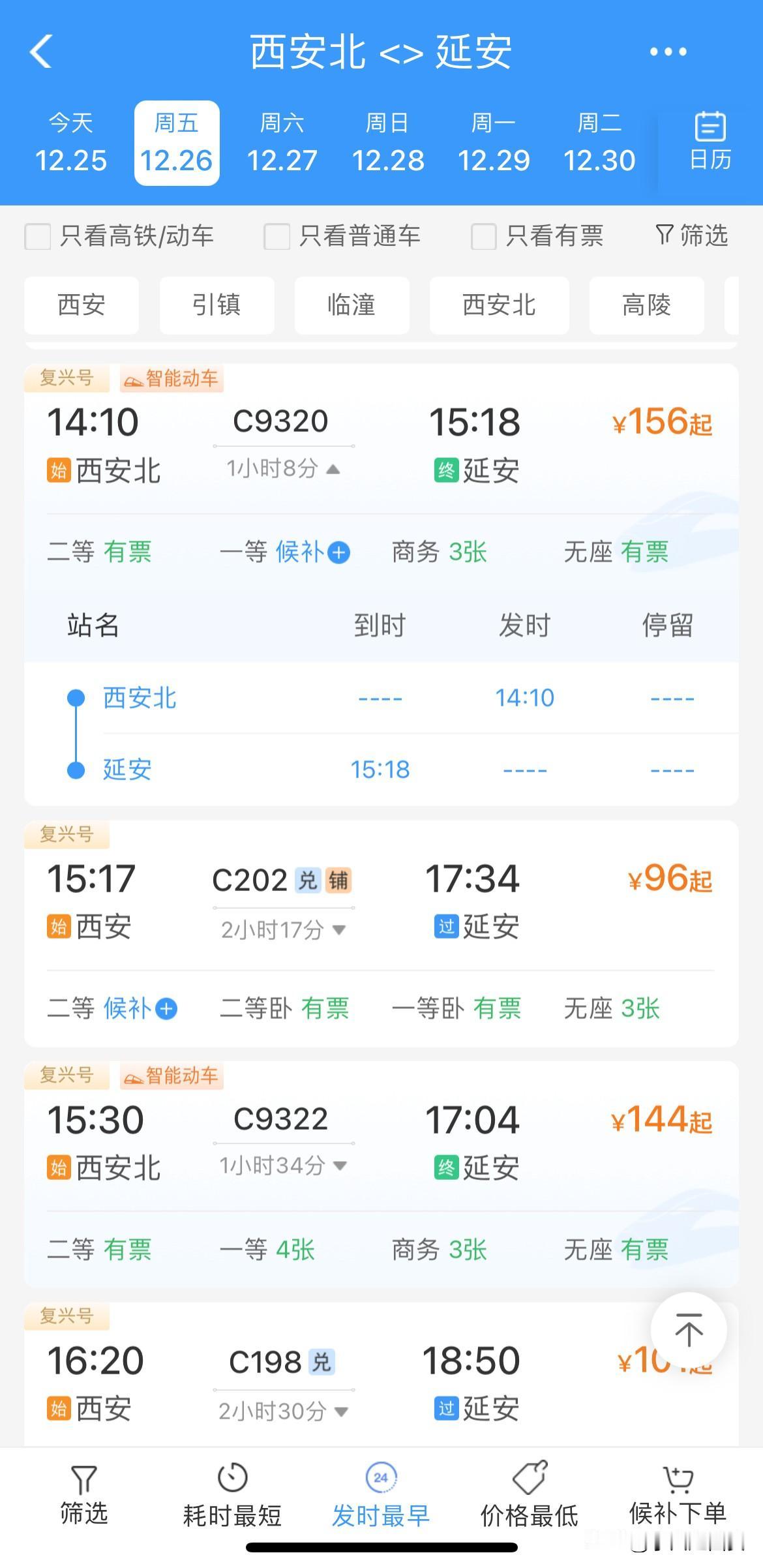 西延高铁🚄12月26日正式开通l 票价出炉 西安到延安高铁🚄明天12月26日 星期五将正式开通,目前国铁12306 已开放购票窗口, 西安到延安二等座票价144元, 首发列车C9314次 上午10.30分从西安北站出发 中午12点整抵达终点站延安, 全程运行时间90分钟,沿途停靠 高陵、铜川北、富县北三站🚉。 标杆列车🚄C9320次下午14.10分 从西安北出发,下午15.18分抵达 终点站延安,此趟列车🚄由西安北🚉 直达延安站🚉,沿途一站不停。 票价二等座156元。 记录我的2025 分享城市新鲜事 西安高铁新路线