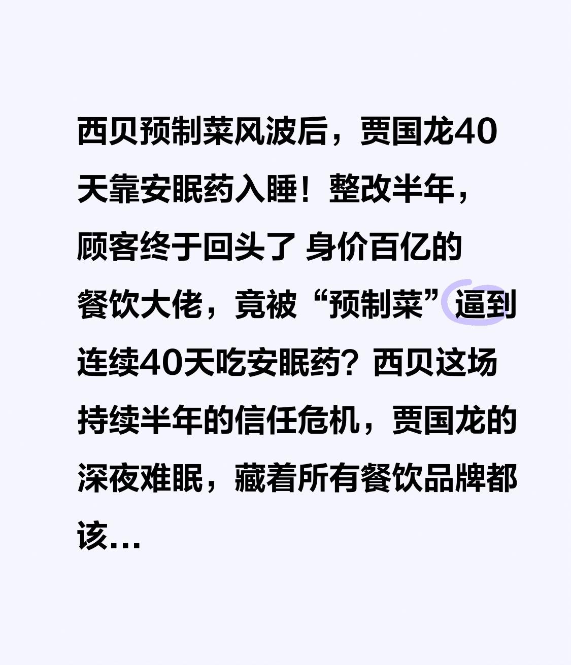 西贝预制菜风波后,贾国龙40天靠安眠药入睡!整改半年,顾客终于回头了 身价百亿的餐饮大佬,竟被“预制菜”逼到连续40天吃安眠药?西贝这场持续半年的信任危机,贾国龙的深夜难眠,藏着所有餐饮品牌都该懂的道理! 去年9月,罗永浩一条“西贝高价卖预制菜”的微博直接引爆舆论。人均150元的餐厅,被扒出用保质期2年的冷冻西兰花,馒头、花卷都是中央厨房做好后门店复热,这和大家期待的“现做烟火气”完全不符。更让消费者不满的是,贾国龙最初硬刚回应“西贝没有一道预制菜”,还开放后厨自证,结果反而暴露更多预加工食材,日营业额直接暴跌超百万,口碑一落千丈。 谁也没想到,这场看似“品牌硬刚消费者”的闹剧,竟藏着关键转折点:沉默100天后,贾国龙在采访中坦言,自己那段时间每天被琐事缠身,连续40天靠安眠药才能入睡,还连说三个“认错”。他终于醒悟,错的不是用中央厨房预加工,而是不该用行业标准对抗消费者认知——按六部委定义,净菜预加工不算预制菜,但食客要的只是“明明白白消费”的知情权。 幡然醒悟后,西贝的整改堪称“刮骨疗毒”:所有门店加装6个摄像头,后厨全程直播,让消费者看得见每一步操作;设立专职食安员,食材贴“7天到期预警”,总部远程监管;10余道菜品回归门店现制,饺子现包、羊肉串现穿,40多道菜品降价20%,人均消费从百元跌至75元左右;还给一线员工涨薪500元,设“食安卫士”津贴,稳住团队军心。 更实在的是,西贝不再纠结“算不算预制菜”的定义之争,而是像老乡鸡那样,用透明回应质疑。如今门店菜单虽未明确标注,但后厨直播、明档现制让消费更放心,有门店周末排号从100桌涨到230桌,客流量彻底回暖。 其实贾国龙的失眠,本质是餐饮行业的信任警钟。消费者反感的从来不是预制菜本身,而是“花现做的钱吃复热菜”的欺骗感,是商家用行业标准当挡箭牌,回避知情权的敷衍。就像网友说的:“不是不能接受预制菜,而是不能接受高价+隐瞒。” 这场风波也让我们看清:餐饮的核心永远是信任。贾国龙的40天失眠,换来了西贝的“阳光厨房”和透明化运营,也给所有餐饮品牌提了醒:消费者要的不是绝对现做,而是坦诚相待;品牌要的不是硬刚舆论,而是正视需求、及时整改。 你现在会为整改后的西贝买单吗?你觉得餐饮品牌该强制标注预制菜吗?欢迎在评论区聊聊你的看法!