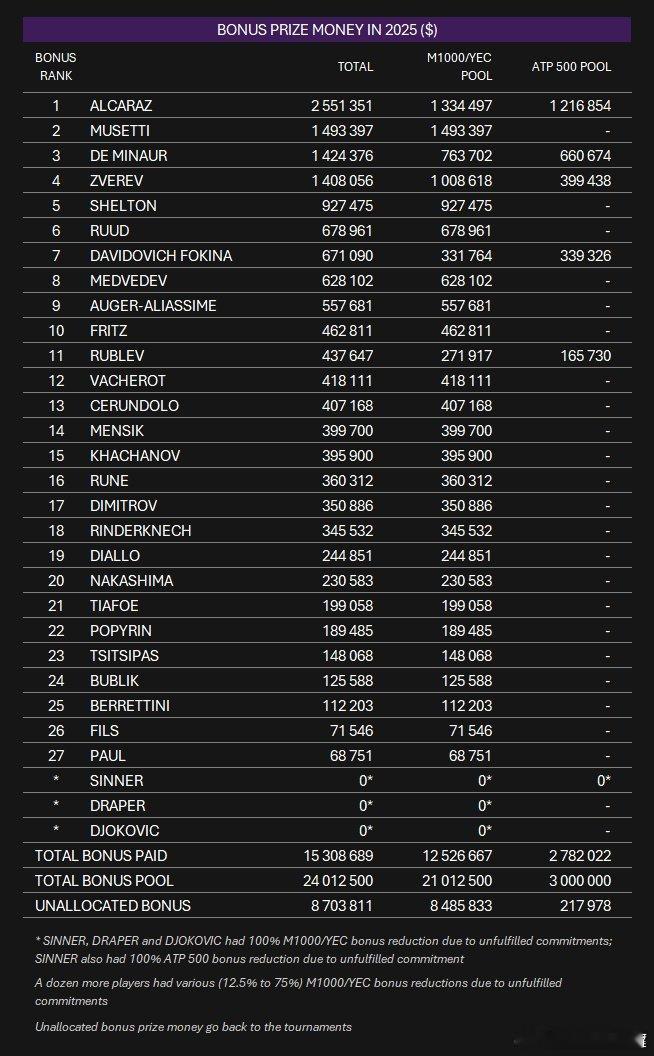ATP针对大师赛和500赛事稳定参赛所设立的奖金,金额已可与大满贯奖金相媲美。目前的奖金榜显示,阿尔卡拉斯达到了一个里程碑式的数字,然而由于违反ATP相关政策,他在历史赛季收入上仍排在德约科维奇之后。 阿尔卡拉斯在2025年共获得了21354778美元的比赛奖金,高居所有男子球员之首,这一收入也凸显了他本赛季的强大实力。 不过,尽管总额不菲,阿尔卡拉斯并未打破德约科维奇的单赛季奖金纪录,德约科维奇在2015年的奖金收入为21146145美元(未计入通胀因素)。阿尔卡拉斯之所以未能超越这一纪录,是因为他的奖金根据ATP巡回赛规则被削减。