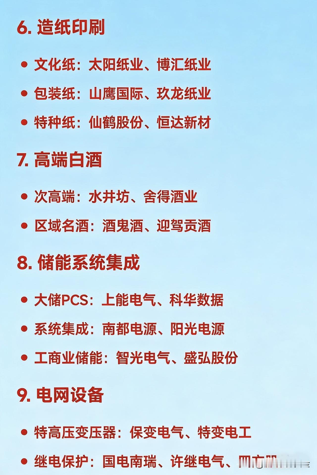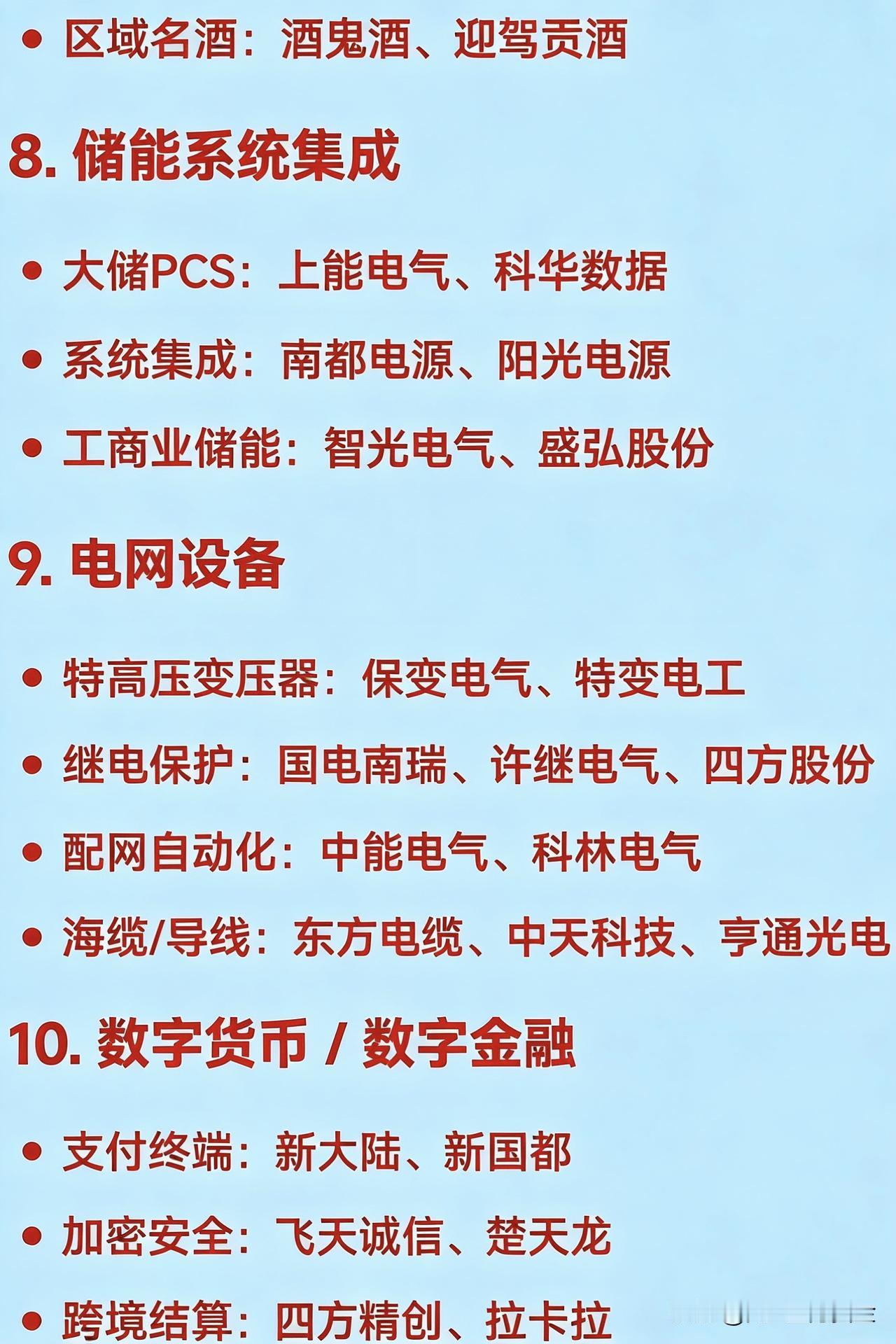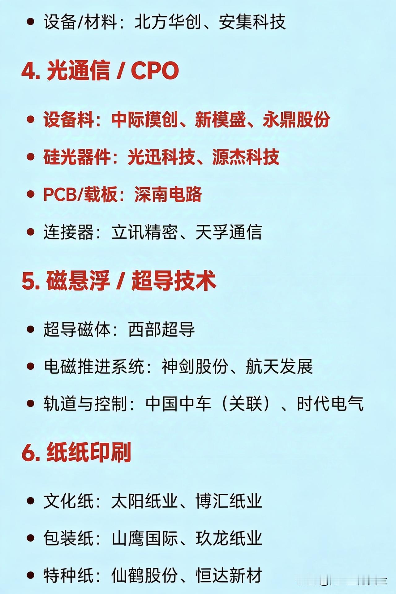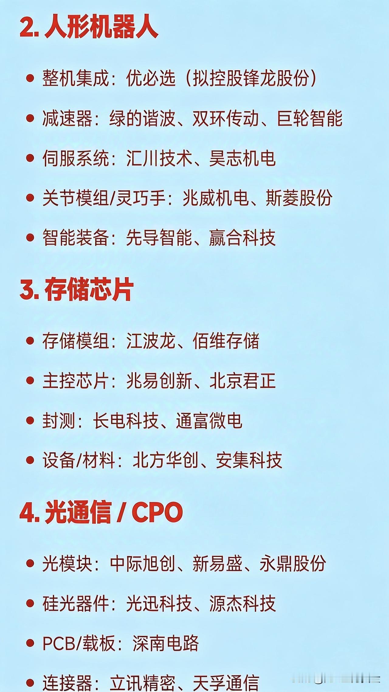 12月25日十大热点概念及产业链龙头梳理 1. 商业航天 卫星制造:中国卫星 火箭总装:中天火箭、航天电子 结构件/材料:超捷股份、广联航空、博云新材、派克新材 航天电子:天奥电子、华菱线缆、龙溪股份 空间电源:上海港湾 卫星通信载荷:通宇通讯 2. 人形机器人 整机集成:优必选(拟控股锋龙股份) 减速器:绿的谐波、双环传动、巨轮智能 伺服系统:汇川技术、昊志机电 关节模组/灵巧手:兆威机电、斯菱股份 智能装备:先导智能、赢合科技 3. 存储芯片 存储模组:江波龙、佰维存储 主控芯片:兆易创新、北京君正 封测:长电科技、通富微电 设备/材料:北方华创、安集科技 4. 光通信 / CPO 光模块:中际旭创、新易盛、永鼎股份 硅光器件:光迅科技、源杰科技 PCB/载板:深南电路 连接器:立讯精密、天孚通信 5. 磁悬浮 / 超导技术 超导磁体:西部超导 电磁推进系统:神剑股份、航天发展 轨道与控制:中国中车(关联)、时代电气 6. 造纸印刷 文化纸:太阳纸业、博汇纸业 包装纸:山鹰国际、玖龙纸业 特种纸:仙鹤股份、恒达新材 7. 高端白酒 次高端:水井坊、舍得酒业 区域名酒:酒鬼酒、迎驾贡酒 8. 储能系统集成 大储PCS:上能电气、科华数据 系统集成:南都电源、阳光电源 工商业储能:智光电气、盛弘股份 9. 电网设备 特高压变压器:保变电气、特变电工 继电保护:国电南瑞、许继电气、四方股份 配网自动化:中能电气、科林电气 海缆/导线:东方电缆、中天科技、亨通光电 10. 数字货币 / 数字金融 支付终端:新大陆、新国都 加密安全:飞天诚信、楚天龙 跨境结算:四方精创、拉卡拉