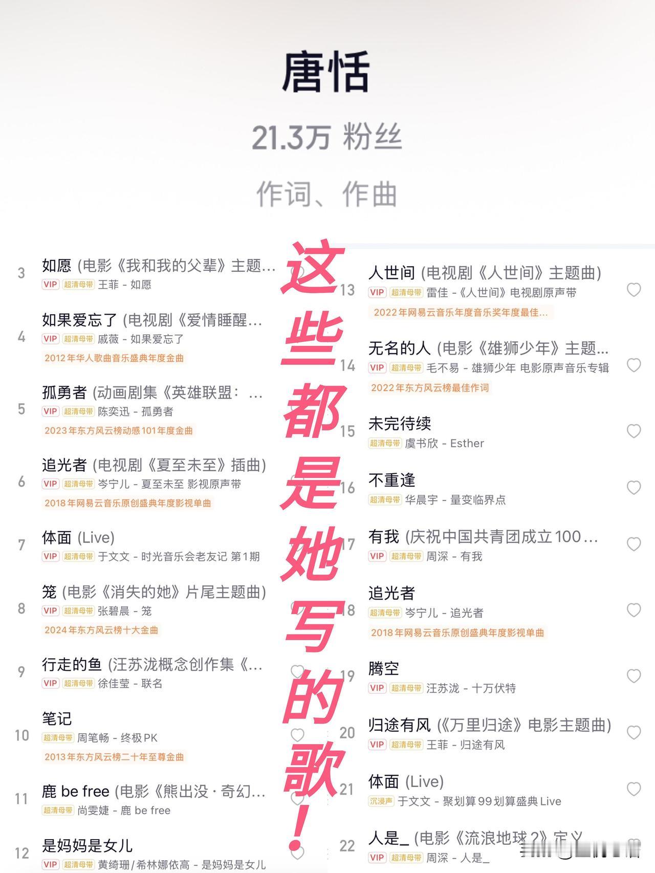 她一人撑起华语乐坛半壁江山, 却鲜有人知。 谁还没被唐恬的歌词戳中过? 《孤勇者》的热血、《如愿》的温柔、《人世间》的沧桑,还有《是妈妈是女儿》的戳心,全是她笔下的作品。 这些歌陪我们熬过深夜、度过难关, 却很少有人知道背后的她。 2011年除夕,她被确诊鼻咽癌, 33次放疗一路艰辛熬过来, 失去味觉嗅觉,却没丢了创作的勇气。 她写《行走的鱼》“忍着痛往前行”, 写《无名的人》致敬每个普通人, 每句歌词都藏着自己与命运对抗的痕迹。 唐恬最牛的地方,是有超强的共情力。 她懂普通人的挣扎,懂亲情的羁绊, 懂追梦的执着, 所以写出来的文字才能直抵人心。 她不说教, 只把自己的经历、他人的故事揉进歌词里, 让我们在歌声里看到自己。 比起流量堆砌的作品, 这样有血有肉的创作才更长久。 感谢唐恬,用一支笔写下人间百态, 给了我们无数治愈和前行的力量。 你最喜欢她写的哪句歌词?评论区分享~