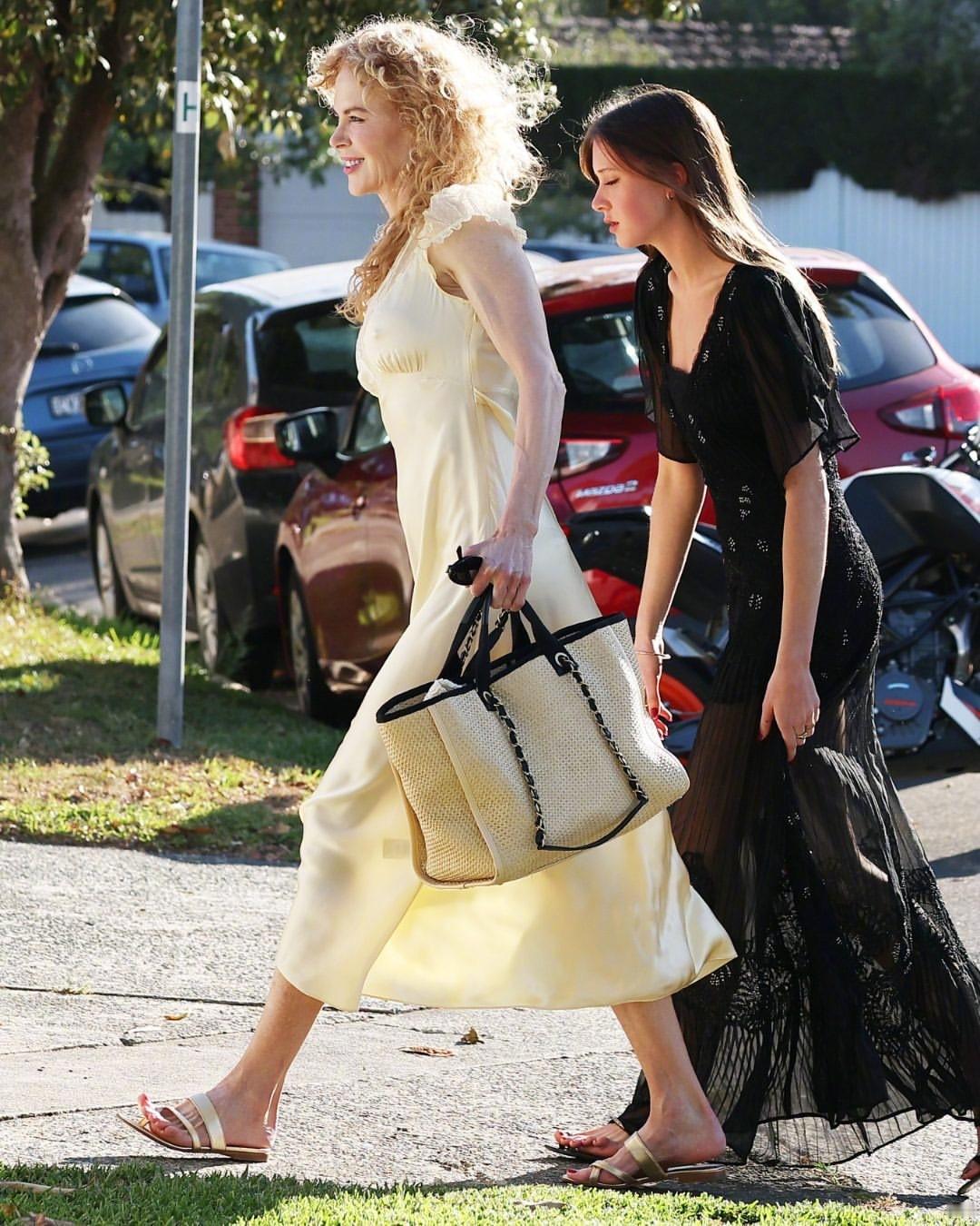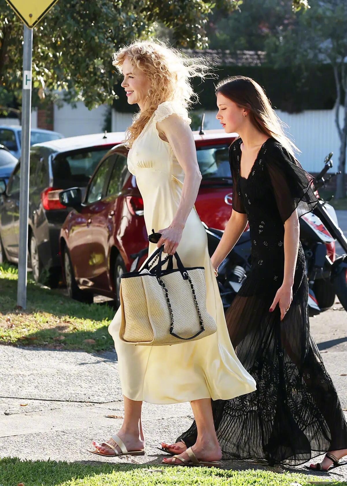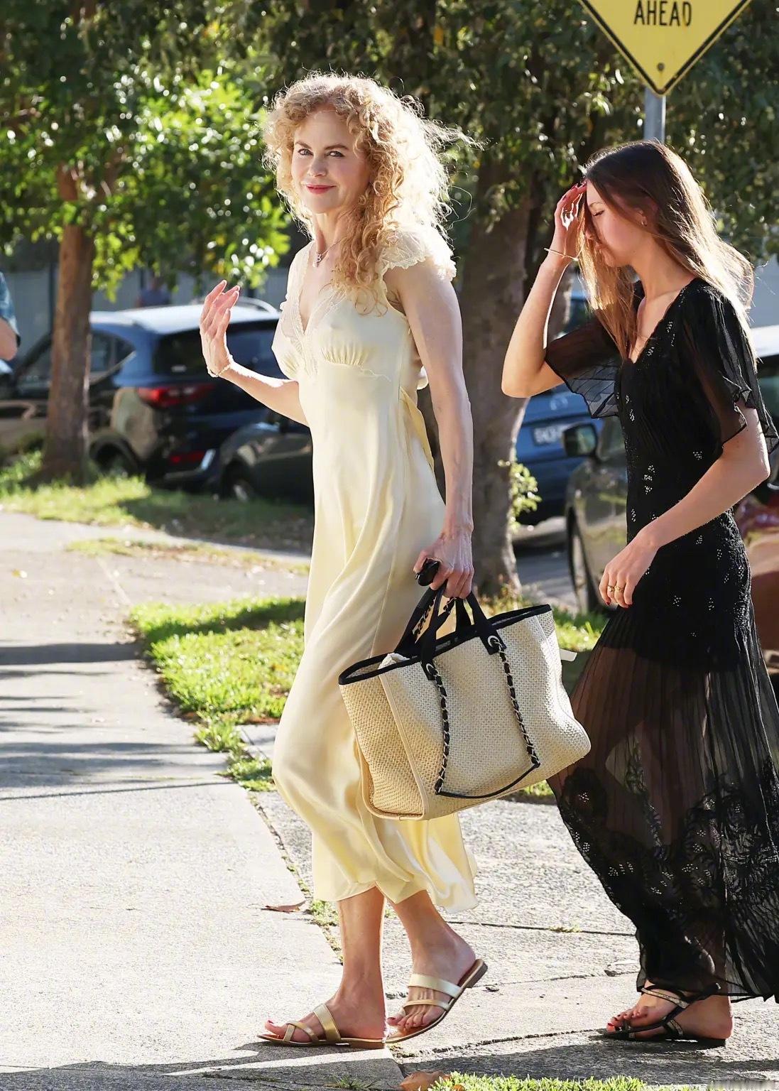 圣诞节,妮可·基德曼和女儿桑迪·罗斯和菲斯·厄本现身澳大利亚与家人一起参加圣诞派对。这是她与前夫分手后的第一个圣诞节,一头金色卷发美艳回归。终于不用再看见那个油腻的前夫了!妮可身穿 DÔEN黄色丝绸吊带裙,脚穿金色Manolo Blahnik 凉鞋,手拎着拉菲草编织的 Chanel 手提包。 米拉服饰解析