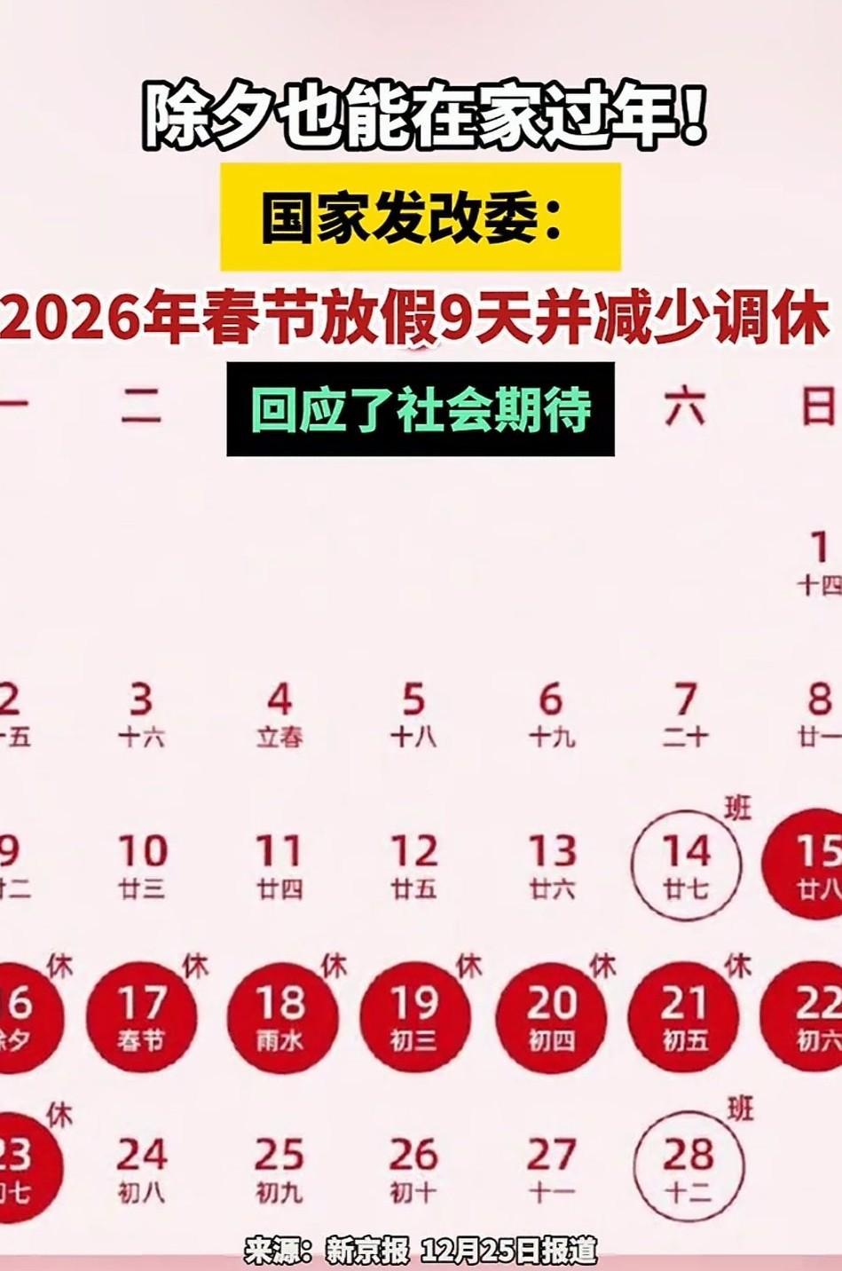 2026春节放假9天!除夕正式纳入假期,调休仅2天太贴心 2026年春节放假安排终于敲定,国家发改委官宣的方案直接让网友们欢呼:“终于能在家过除夕了!” 此次春节假期从2月15日(腊月二十八)一直放到2月23日(正月初七),整整9天的长假。 不仅是史上最长春节假期,还大幅减少了调休压力。 仅需在2月14日(周六)和2月28日(周六)补班两天,彻底告别往年调休后连续上班的疲惫。 最让人欣喜的是,除夕被正式纳入春节假期范畴。 过去不少人因为工作调休,往往赶在除夕当天匆忙返乡,如今有了假期加持,大家能踏踏实实在家和家人一起贴春联、吃年夜饭,好好感受年味儿。 这一安排是国家发改委响应社会期待的结果,此前人大代表多次提议优化节假日设置,让春节假期更贴合民众的返乡、团圆需求。 从反馈来看,网友对9天长假+少调休的组合认可度极高,纷纷表示“这才是真正的春节假期”。 除了假期时长,春节期间小型客车高速通行也将延续免费政策,9天的假期窗口也给大家的返乡、出游计划留足了空间。 不管是回老家陪父母,还是计划一场春节旅行,都有了更充裕的时间安排。 2026年的春节,终于能慢下来感受年味了,你打算怎么安排这9天假期呢? (内容取材网络)  点亮〔收藏和赞〕你我一起成长