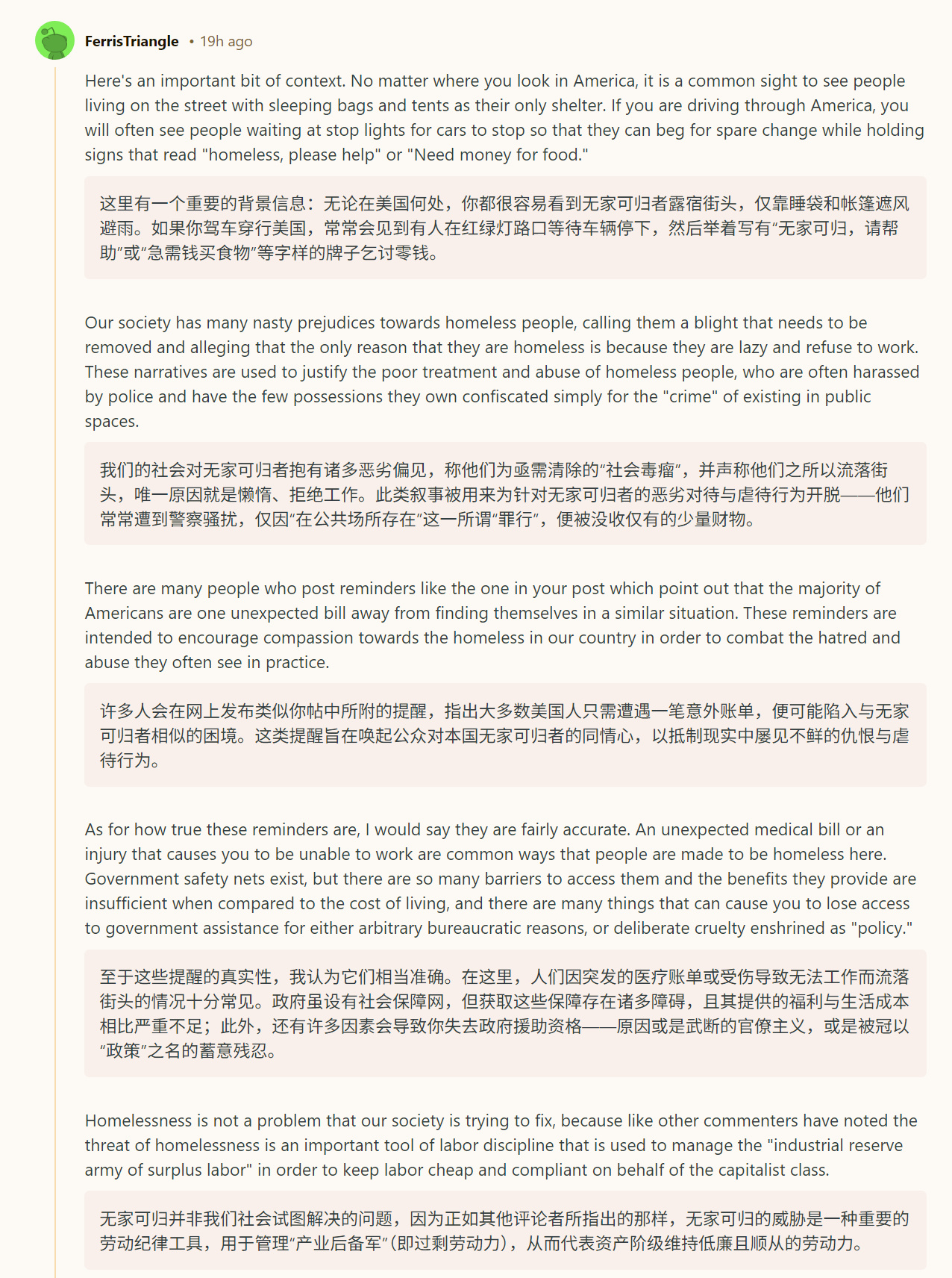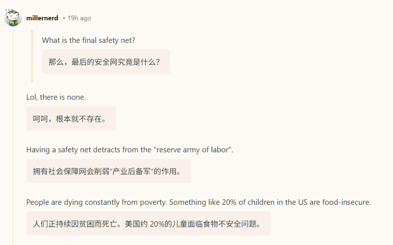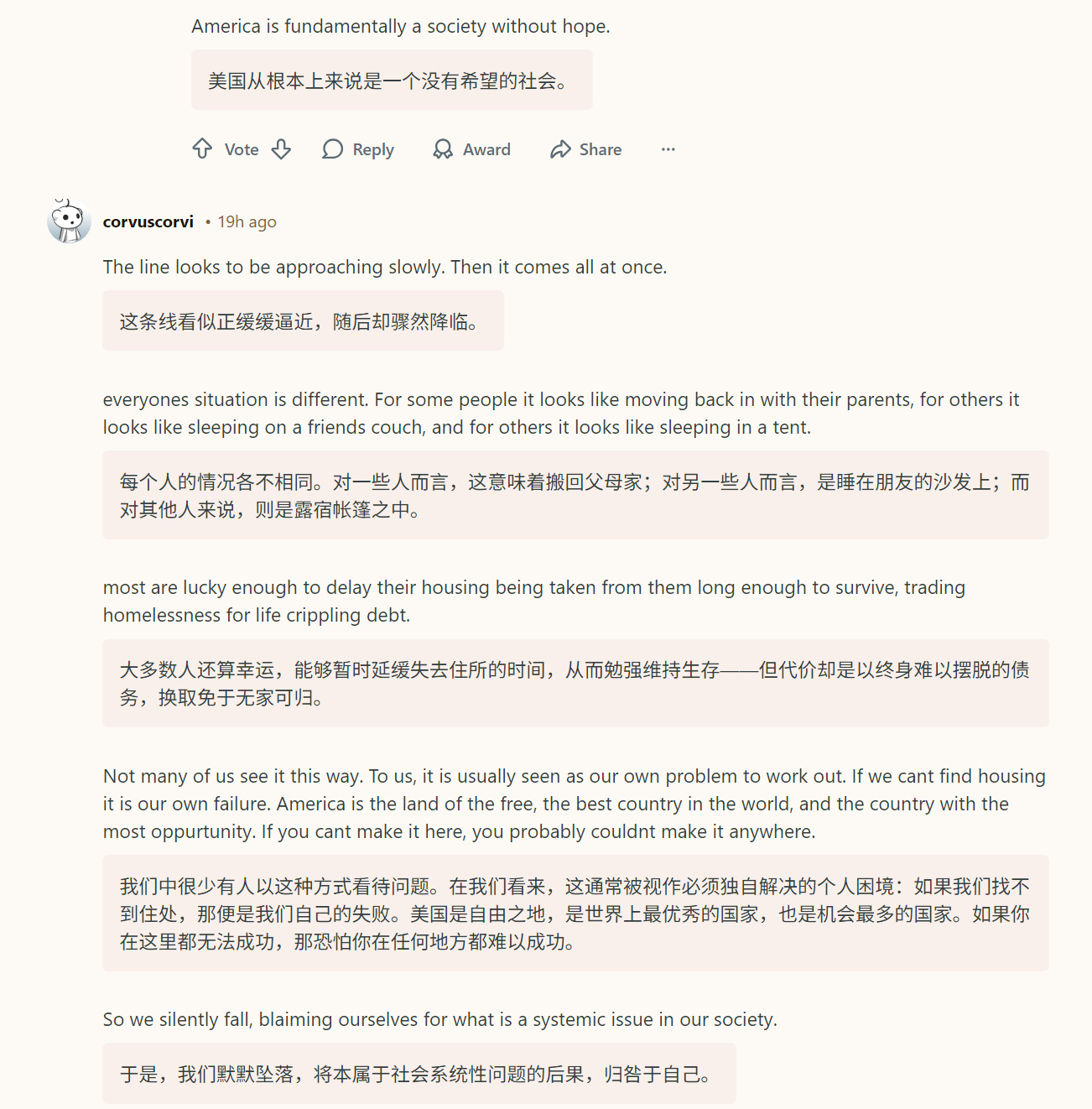 🔻超短篇。🔻不管高华和大侄子们如何跳脚,现实就是美国人坦然承认了“斩杀线”这种事情。🔻“斩杀线”是中国人言简意赅的形象描述,在美国,专业术语叫做ALICE threshold,又或者Cycle of homelessness,又或者Downward spiral homelessness、Chronic homelessness、Homelessness pipeline……🔻因为美国并不认为这是输,它们甚至认为这也是美国的某种“竞争力”。🔻正如美国人自己总结的:🔹“无家可归并非我们美国社会试图解决的问题,因为正如其他评论者所指出的那样,无家可归的威胁是一种重要的劳动纪律工具,用于管理‘产业后备军’(即过剩劳动力),从而代表资产阶级维持低廉且顺从的劳动力。”🔹“如果奴隶制无法强制执行,它就不会奏效,正因如此,我们美国人才一直被维持在贫困状态,这是一种对美国劳动者的控制手段。”🔹“这令人恐惧,却恰好让我们乖乖听话,好让股东赚取更多利润……美国社会学家创造了一个新术语——‘不稳定的无产者’(precariat)”🔻这里面蕴含着马克思主义政治经济学的基本逻辑:为什么美国生产那么多食品,美国人却要饿肚子?因为这是资本主义规律的内部矛盾的展开。🔻资本及其自行增殖,表现为生产的起点和终点,表现为生产的动机和目的;生产只是为资本而生产,而不是相反:生产资料只是不断扩大生产者社会的生活过程的手段。所以,美国资本的产品生产,并不以改善美国人的生活水平为目的,并不以解决美国人日益增长的物质和精神需求与不平衡不平等社会现状的矛盾为目标。🔻以广大生产者群众的被剥夺和贫困化为基础的资本价值的保存和增殖,只能在一定的限制以内运动,这些限制不断与资本为它自身的目的而必须使用的并旨在无限制地增加生产,为生产而生产,无条件地发展劳动社会生产力的生产方法相矛盾。手段——社会生产力的无条件的发展——不断地和现有资本的增殖这个有限的目的发生冲突。🔻资本主义既需要社会化大生产,也需要消费,但更本质的需求则是增值,是剥削和扩张。🔻所以,劳动生产力的发展使利润率的下降成为一个规律,这个规律在某一点上和劳动生产力本身的发展发生最强烈的对抗,因而必须不断地通过危机来克服。资本主义的危机就在不断的酝酿—爆发—酝酿中循环。🔻如果利润率下降,那么一方面,资本就紧张起来,个别资本家就用更好的方法等等,把他的单个商品的个别价值压低到它的社会平均价值以下,因而在市场价格已定时赚得额外利润;另一方面,就出现了欺诈,而普遍促进这种欺诈的是狂热地追求新的生产方法、新的投资、新的冒险,以便取得某种不以一般平均水平为转移并且高于一般平均水平的额外利润。🔻生活资料和现有的人口相比不是生产得太多了。正好相反。要使大量人口能够体面地、象人一样地生活,生活资料还是生产得太少了。🔻为了缓和矛盾,资本家提高工人待遇,以满足工人的最基本生活需求。🔻发达国家的公司剥削工资低得多的发展中国家的工人。利润的增加使这些公司能够向发达国家的员工支付更高的工资,从而形成了一个对自己的生活水平感到满意、不倾向于无产阶级革命的工人阶级。这是一种输出贫困的形式,创造了一个社会下层的“飞地”。🔻列宁认为,帝国主义阻止了发达国家阶级分化的加剧。那些压榨发展中国家的赤贫工人并从中获取超额利润的发达国家工人(无产阶级),不是“工人阶级”,而是“工人贵族”。🔻但是,资本与工人同样是天生对立的,要使劳动资料和生活资料作为按一定的利润率剥削工人的手段起作用,劳动资料和生活资料就周期地生产得太多了。要使商品中包含的价值和剩余价值能够在资本主义生产所决定的分配条件和消费关系下实现并再转化为新的资本,就是说,要使这个过程能够进行下去,不致于不断地发生爆炸,商品就生产得太多了。 🔻当资本对劳动者的过度剥削发展到劳动者无力购买足够的生产产品的时候,生产过剩和经济危机就出现了。🔻由于人工成本持续增长,追求更高利润的资本家选择向人工成本更低的国家转移物质生产部门,从而造成了产业空心化。🔻对资本主义生产方式来说,只要不再需要每天使用劳动力12—15小时,劳动力就已经过剩了。只要生产力的发展,会使工人的绝对人数减少,就是说,只要它实际上会使整个国家能在较少的时间内完成自己的全部生产,它就会引起革命,因为它会断绝大多数人口的活路。因此引发美国的社会危机,造成大量美国工人失业,成为无家可归者。🔻这样就再次造成了恶性循环:美国资产阶级克服危机只能消灭大量生产力和夺取新的市场——故意使其他地区发展不足,需要它们继续成为资源开采中心,以便廉价出口农产品、矿产和其他商品——社会矛盾缓和后,美国资本家继续压榨本国工人——工人生存压力提高,再次引发美国社会危机——美国继续在海外制造贫穷和经济不发达,剥削他们以缓和美国的危机。🔻而这样的恶性循环更进化的版本是:由于美国国内生产力不足,美国无法通过掠夺海外原料来制造更多的商品,只能进口更多的商品,进口的增多导致就业的减少,推高通胀,为缓和危机只能给海外商品加关税,但没有平替的商品,加关税只能传导通胀。这就是教科书式的“输入型通胀”。🔻美联储把汇率拉到美国极限,就是为了拉爆世界债市,让基于不平等市
