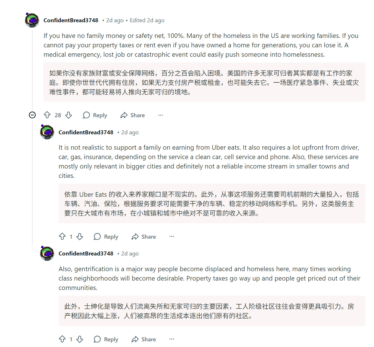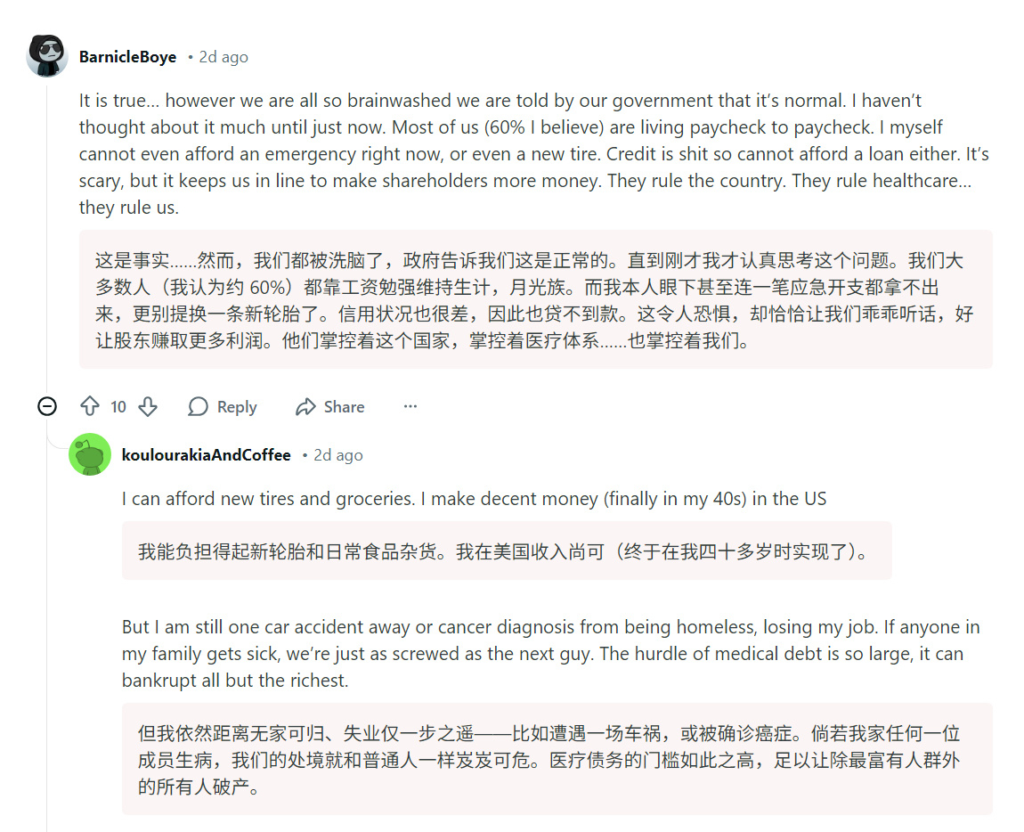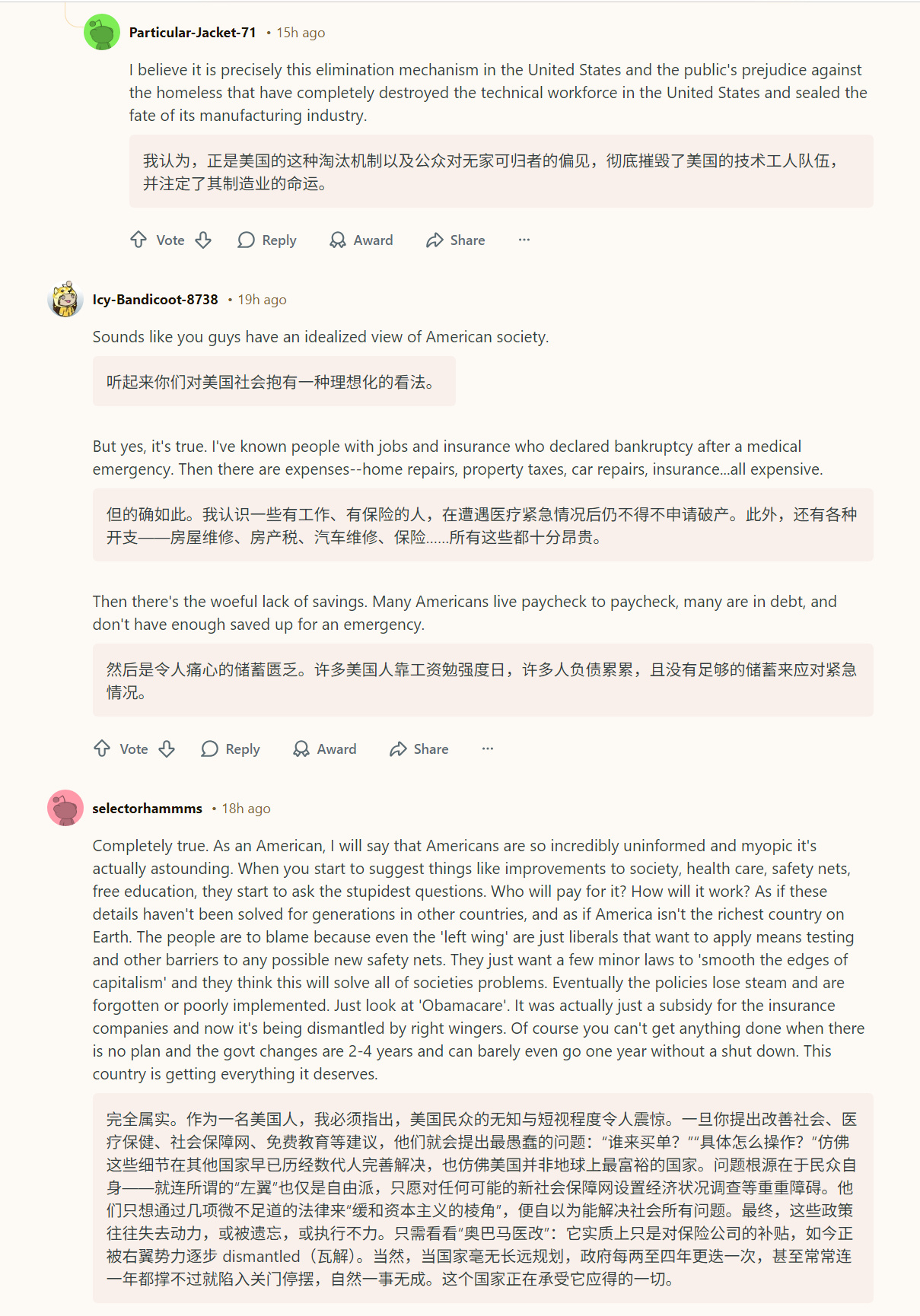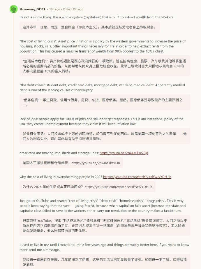 🔻超短篇。🔻不管高华和大侄子们如何跳脚,现实就是美国人坦然承认了“斩杀线”这种事情。🔻“斩杀线”是中国人言简意赅的形象描述,在美国,专业术语叫做ALICE threshold,又或者Cycle of homelessness,又或者Downward spiral homelessness、Chronic homelessness、Homelessness pipeline……🔻因为美国并不认为这是输,它们甚至认为这也是美国的某种“竞争力”。🔻正如美国人自己总结的:🔹“无家可归并非我们美国社会试图解决的问题,因为正如其他评论者所指出的那样,无家可归的威胁是一种重要的劳动纪律工具,用于管理‘产业后备军’(即过剩劳动力),从而代表资产阶级维持低廉且顺从的劳动力。”🔹“如果奴隶制无法强制执行,它就不会奏效,正因如此,我们美国人才一直被维持在贫困状态,这是一种对美国劳动者的控制手段。”🔹“这令人恐惧,却恰好让我们乖乖听话,好让股东赚取更多利润……美国社会学家创造了一个新术语——‘不稳定的无产者’(precariat)”🔻这里面蕴含着马克思主义政治经济学的基本逻辑:为什么美国生产那么多食品,美国人却要饿肚子?因为这是资本主义规律的内部矛盾的展开。🔻资本及其自行增殖,表现为生产的起点和终点,表现为生产的动机和目的;生产只是为资本而生产,而不是相反:生产资料只是不断扩大生产者社会的生活过程的手段。所以,美国资本的产品生产,并不以改善美国人的生活水平为目的,并不以解决美国人日益增长的物质和精神需求与不平衡不平等社会现状的矛盾为目标。🔻以广大生产者群众的被剥夺和贫困化为基础的资本价值的保存和增殖,只能在一定的限制以内运动,这些限制不断与资本为它自身的目的而必须使用的并旨在无限制地增加生产,为生产而生产,无条件地发展劳动社会生产力的生产方法相矛盾。手段——社会生产力的无条件的发展——不断地和现有资本的增殖这个有限的目的发生冲突。🔻资本主义既需要社会化大生产,也需要消费,但更本质的需求则是增值,是剥削和扩张。🔻所以,劳动生产力的发展使利润率的下降成为一个规律,这个规律在某一点上和劳动生产力本身的发展发生最强烈的对抗,因而必须不断地通过危机来克服。资本主义的危机就在不断的酝酿—爆发—酝酿中循环。🔻如果利润率下降,那么一方面,资本就紧张起来,个别资本家就用更好的方法等等,把他的单个商品的个别价值压低到它的社会平均价值以下,因而在市场价格已定时赚得额外利润;另一方面,就出现了欺诈,而普遍促进这种欺诈的是狂热地追求新的生产方法、新的投资、新的冒险,以便取得某种不以一般平均水平为转移并且高于一般平均水平的额外利润。🔻生活资料和现有的人口相比不是生产得太多了。正好相反。要使大量人口能够体面地、象人一样地生活,生活资料还是生产得太少了。🔻为了缓和矛盾,资本家提高工人待遇,以满足工人的最基本生活需求。🔻发达国家的公司剥削工资低得多的发展中国家的工人。利润的增加使这些公司能够向发达国家的员工支付更高的工资,从而形成了一个对自己的生活水平感到满意、不倾向于无产阶级革命的工人阶级。这是一种输出贫困的形式,创造了一个社会下层的“飞地”。🔻列宁认为,帝国主义阻止了发达国家阶级分化的加剧。那些压榨发展中国家的赤贫工人并从中获取超额利润的发达国家工人(无产阶级),不是“工人阶级”,而是“工人贵族”。🔻但是,资本与工人同样是天生对立的,要使劳动资料和生活资料作为按一定的利润率剥削工人的手段起作用,劳动资料和生活资料就周期地生产得太多了。要使商品中包含的价值和剩余价值能够在资本主义生产所决定的分配条件和消费关系下实现并再转化为新的资本,就是说,要使这个过程能够进行下去,不致于不断地发生爆炸,商品就生产得太多了。 🔻当资本对劳动者的过度剥削发展到劳动者无力购买足够的生产产品的时候,生产过剩和经济危机就出现了。🔻由于人工成本持续增长,追求更高利润的资本家选择向人工成本更低的国家转移物质生产部门,从而造成了产业空心化。🔻对资本主义生产方式来说,只要不再需要每天使用劳动力12—15小时,劳动力就已经过剩了。只要生产力的发展,会使工人的绝对人数减少,就是说,只要它实际上会使整个国家能在较少的时间内完成自己的全部生产,它就会引起革命,因为它会断绝大多数人口的活路。因此引发美国的社会危机,造成大量美国工人失业,成为无家可归者。🔻这样就再次造成了恶性循环:美国资产阶级克服危机只能消灭大量生产力和夺取新的市场——故意使其他地区发展不足,需要它们继续成为资源开采中心,以便廉价出口农产品、矿产和其他商品——社会矛盾缓和后,美国资本家继续压榨本国工人——工人生存压力提高,再次引发美国社会危机——美国继续在海外制造贫穷和经济不发达,剥削他们以缓和美国的危机。🔻而这样的恶性循环更进化的版本是:由于美国国内生产力不足,美国无法通过掠夺海外原料来制造更多的商品,只能进口更多的商品,进口的增多导致就业的减少,推高通胀,为缓和危机只能给海外商品加关税,但没有平替的商品,加关税只能传导通胀。这就是教科书式的“输入型通胀”。🔻美联储把汇率拉到美国极限,就是为了拉爆世界债市,让基于不平等市