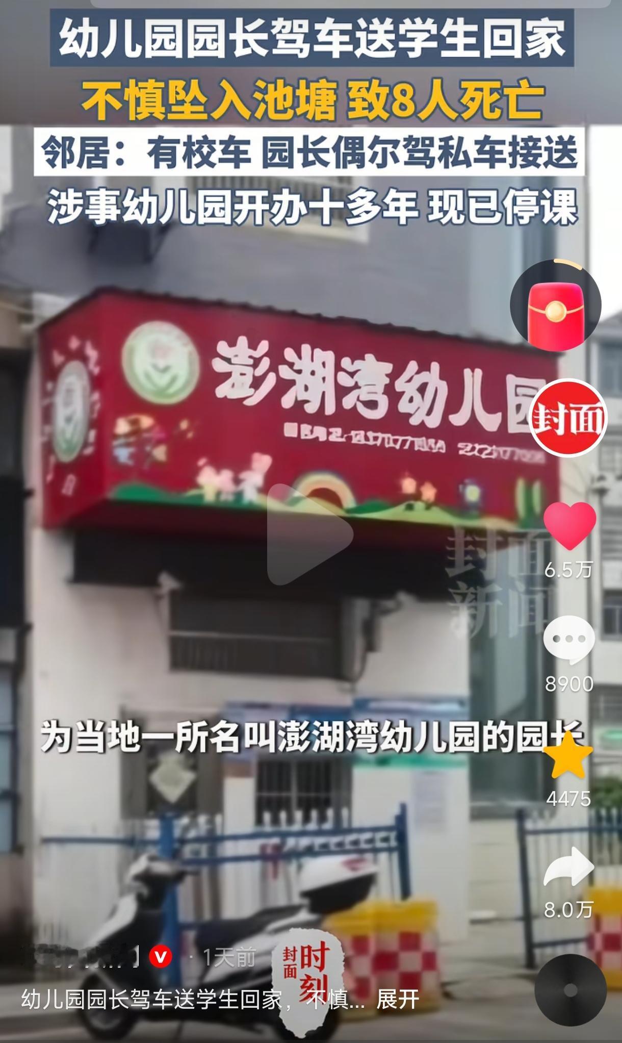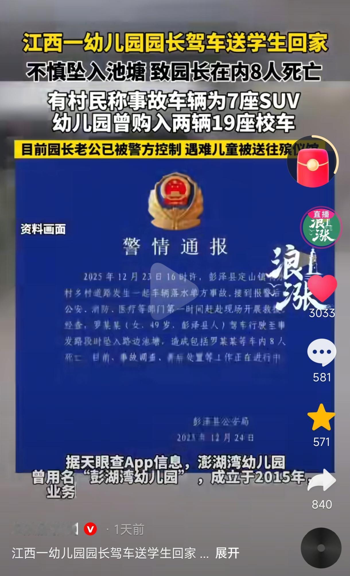 “太惨痛了!” 江西九江,49岁幼儿园园长驾车送学生回家,不慎坠入池塘,致园长在内8人全部身亡,包括6名幼儿。附近村民赶来施救,但因水位太深且打不开车门,车辆便沉入塘底......这突如其来的悲剧猝不及防,看得人忍不住心疼落泪。 (来源:浪涨新闻,封面新闻等) 这起悲剧发生在2025年12月23日,太让人心痛了。作为澎湖湾幼儿园园长的49岁罗某某也是好心送学生回家,学生们大部分是留守儿童,平时只有爷爷奶奶在家,年纪大了无法接送孩子们。 当时罗园长正驾着一辆7座SUV车辆行驶在彭泽县的乡村道路上,此前罗老师已经前往不同村庄送了多名孩子回家。 但在经过一个带弯道的狭窄下坡路段时,由于雨天路滑,池塘又刚清淤泥路面泥泞,车辆便打滑坠入了池塘深处......车上还有6名儿童。 附近村民发现后跑来施救,但因池塘水位太深达3米且无法打开车门,施救十分困难,车辆很快就沉入塘底。之后相关部门赶来救援,但8人全部殒命,真是太悲惨了! 据新闻称,该所民办幼儿园是开了10多年,这期招了周边村子及较远地方40多名学生,为此购了2辆19座校车来接送学生,遇学生多时罗园长还会亲自开私家车接送,事发时开的就是自家一辆7座的SUV轿车。 在家长们看来,罗老师口碑极好,因为孩子们大多是留守儿童,只有爷爷奶奶在家,而爷奶年纪大了根本没法骑车接送,罗老师就帮忙接送。 确实,现实乡村学校好多都停办了,要上学就要到镇上去读,而这接送就成了问题,我们那镇上的学校是不帮忙接送的让家长自己想办法。有的家长为了孩子上学方便,砸锅卖铁在镇上买了房子,但经济条件差或留守儿童家庭就没法了,还得每天回村里。 还有村里的路不仅窄小,还七弯八绕的,如果再加上路面湿滑,车技又不是很好,开车也是十分危险的。 这事看得人心里太难受了,罗老师好心办了坏事,致六名留守儿童遇难,可她自己也没了呀,感觉这完全是天降人祸,没人能预料。 但不得不承认,起因还是在罗老师的侥幸上,她完全可以用19座合规的校车接送孩子,却用私家车超载代送,这确实没有将安全放在首位,最终酿下了惨剧。 如果罗老师当时驾的是校车,说不定大家还有生还的可能,因为校车有安全配置如:破窗器、应急大锤等,而私家车没有,落水后水压顶死打不开,致援救困难。 还有,池塘边上的防护也是形同虚设,只在临水急弯扎了木杆铁丝,这种连小车都拦不住,完全是典型的“看得见的隐患没人管”。 不管营运还是防护,都应该引起重视。其实13年前江西贵溪就出过校车坠塘11童死亡的惨案,教训全忘了,难道还不够惨痛吗?