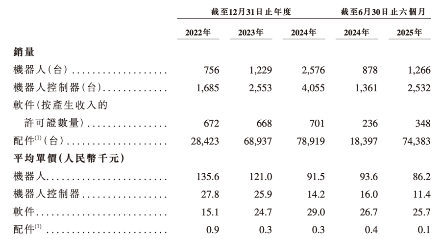 公司核心产品平均单价出现下降。机器人单价从2022年的13.56万元降至2025年6月末的8.62万元。公司在招股书中表示:“我们的机器人及机器人控制器平均单价持续下降,主要由于上游零部件成本下降以及规模经济效益日益显现,使我们能够在维持稳定毛利率的同时,优化供应链及生产成本并调整定价。”