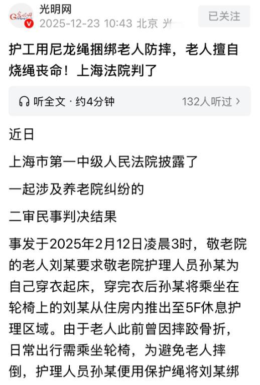 12月22日报道,上海,一老人凌晨3点在敬老院醒后,坐上轮椅被护工推到休息区,由于老人之前摔骨折过,护工怕他又摔倒,就按约定好的方法,用尼龙绳将他绑在轮椅上,随即离开忙别的事了,老人无聊,独自坐电梯来到一楼后,想解开绳子,几次解开未果后,老人掏出打火机想烧断绳子,谁料,绳子迅速燃烧,点燃轮椅,最终烧至全身,老人身亡。事后家属诉至法院,要求敬老院担全责,索赔死亡赔偿金及丧葬费193万。法院判决出乎意料。 一位老人在凌晨被护工用绳子绑在了轮椅上,结果老人为了解开绳子,竟然掏出打火机想烧断它,最后不幸引火烧身,活活给烧死了,家属悲痛欲绝,一张口就要敬老院赔193万,要求全责。 2025年2月12号那天,大概凌晨3点的时候,敬老院里的刘大爷醒了,他把护工孙某叫来,让人帮忙把衣服穿好,然后扶着坐到了轮椅上。 因为刘大爷以前摔骨折过,腿脚不太利索,护工怕他又摔着,就按以前商量好的法子,拿了根尼龙绳在他腰和肚子那绕了一圈,死死地绑在了轮椅上。 绑的时候刘大爷也没闹,还自己挪了挪身子配合,绑好了,护工给他倒了杯水,随便聊了两句,就转身去忙活别的事了。 谁也没想到,护工前脚刚走没五六分钟,刘大爷就自己推着轮椅,坐电梯下到了一楼大厅,监控录像拍得清清楚楚,3点20分的时候他到了大厅,然后就开始在那费劲巴拉地解绳子。 可那尼龙绳系得太紧了,他怎么解都解不开,刘大爷平时爱抽烟,身上正好带着个打火机,大概是急眼了,脑子一热就想用打火机把绳子烧断。 到了3点25分,他掏出打火机对着绳子就点,那尼龙绳本来就容易着火,一下子就烧起来了,火苗子窜得老高,很快就顺着烧到了轮椅右边的轮胎。 刘大爷毕竟岁数大了,手脚不听使唤,想灭火灭不掉,想站起来喊人也站不起来,只能眼睁睁看着火越来越大,到了3点36分,火就已经吞噬了他全身,直到3点47分,巡逻的工作人员才发现这着火了,可那时候刘大爷已经没气了,从头到尾,没有任何一个工作人员及时赶到。 这好好的一条人命说没就没了,家属哪能接受得了?没过多久就把敬老院给告了,索赔死亡赔偿金加上丧葬费一共193万多,一口咬定敬老院得负全责。 家属觉得,刘大爷身体其实没那么差,根本用不着绑什么束缚带,退一万步说,就算真要绑,敬老院作为专业机构,也该用那种专业的不易燃的带子,而不是随便拿根尼龙绳糊弄,而且护工把老人绑上了就扔那不管,这明显是失职。 敬老院那边肯定不认这个全责,把之前签的合同拿出来说话,合同上白纸黑字写着,要是老人因为自己的过错导致意外,责任得自己担着,而且他们解释说,用绳子固定那是为了保护老人,怕他摔倒,双方是你一句我一句,谁也不肯让步。 法院审理之后,给出了个判决:刘大爷虽然年纪大了,但他是完全民事行为能力人,脑子没糊涂,应该知道用打火机烧绳子有多危险,所以他对自己的死亡要负主要责任。 但是呢,敬老院也没跑了,不仅用了易燃的尼龙绳代替规范的束缚带,还把被捆着的老人单独扔那儿不管,看护义务没尽到位,所以要承担30%的赔偿责任。 最后账算下来,敬老院得赔58万多的损失,再加上1.5万的精神损失费和1万块钱律师费,总共赔了60万出头,家属不服气,又上诉了一次,结果二审法院还是维持了原判。 这事一传到网上,网友们也是炸了锅,有的说:“这护工心也太大了,把老人绑着就不管了,万一出点啥事谁知道啊?” 也有人觉得:“老人自己也有责任啊,明知道那是火,还敢往绳子上点,这不是找事吗?”还有人感叹:“这敬老院也不专业啊,既然是干这行的,防护措施和看护都得到位才行,尼龙绳那种东西哪能用来绑人啊,根本就不安全。” 其实说到底,这起悲剧就是给所有的养老机构敲了个警钟,保障老人的安全不能光靠简单的“捆绑”,得用规范的防护装备,还得有到位的看护,这才最关键。 而对于老人们来说,遇事千万别自己瞎琢磨,有啥困难找工作人员帮忙,千万别用这种危险的方式去解决问题。 希望这样的悲剧以后再也别发生了,让老人们都能在敬老院里安安心心地养老,别让家属再这么伤心了。 对此你怎么看? 信源:光明网