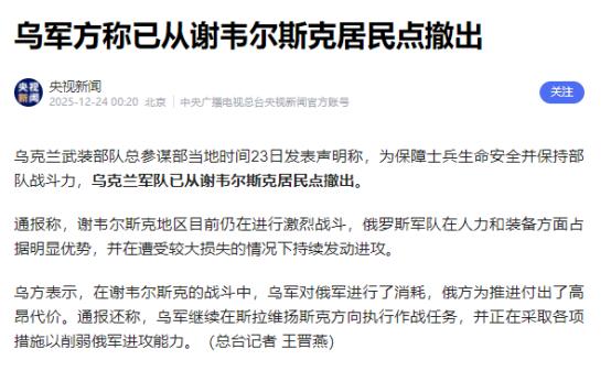 撑不下去了?乌克兰宣布撤军。 12月23日,乌军方正式承认已从顿巴斯重镇谢韦尔斯克撤军。这座曾被双方反复争夺的居民点失守,不仅是一城一地的得失,更让乌东战线迎来重大变局。 俄乌双方在这里撕扯了这么久,这次乌军宣布撤军,看起来是个地方性战事调整,但往大了看,却难掩乌军的困境! 谢韦尔斯克不是普通小村子,作为顿涅茨克地区的核心堡垒,地势低洼的它被四周高地环绕,之前一直是乌军在乌东的重要防御支点,双方你来我往反复拉锯,每一寸土地都浸过炮火。 乌军这回主动撤出,嘴上说是为了保存有生力量、给俄军造成了不小损耗,可明眼人都能看出来,实在是顶不住了。 俄军能拿下这座重镇,也不是靠硬冲蛮干。一开始进攻节奏很慢,后来及时调整战术,加派航空兵支援还强化了无人机打击,一点点瓦解了乌军的高地防御优势。 乌军在恶劣天气里被俄军小规模部队持续纠缠,补给跟不上还没了制空权优势,坚守下去只会被慢慢消耗殆尽,撤退成了唯一的选择。 更有意思的是,俄军早前就宣称占领了谢韦尔斯克,乌军当时还坚决否认,如今正式官宣撤军,相当于变相承认了战场态势的被动。 谢韦尔斯克的失守,本质上是乌军整体战力透支的集中体现。最关键的问题还是外援掉了链子,这仗根本没法打持久战。 2025年以来西方对乌援助锐减,美国的援助从2024年的500亿美元直接砍到今年的约50亿美元,降幅大到惊人。 欧盟虽然吵了17个小时才敲定2026到2027年给乌克兰900亿欧元贷款,可这笔钱不是无偿赠款,还得靠24个成员国联合举债筹集,捷克、匈牙利等三国压根不愿参与担保,内部分歧摆上台面。 更要命的是这笔贷款最早要到2026年4月才分批到位,而且只能覆盖乌克兰未来两年资金缺口的三分之二。 2025年前十个月乌克兰收到的援助总额创下开战以来新低,下半年更是惨不忍睹,欧洲7到10月筹集的援助还不到80亿欧元,连上半年的一半都够不上。 没有持续的资金和武器补给,乌军别说反攻,就连守住现有防线都成了奢望,之前库尔斯克战役里,不少王牌旅被打得只剩一两营残兵,精锐力量损耗殆尽,如今根本没足够兵力填补顿巴斯的防线缺口。 俄军显然也看透了乌军的短板,拿下谢韦尔斯克后,下一步矛头大概率会指向斯拉维扬斯克和克拉马托尔斯克这两座关键城市,这两座城是乌军在顿巴斯的最后核心防线,一旦被突破,乌东战线可能会全面崩溃。 乌军虽说撤出后还能对谢韦尔斯克进行火力覆盖,号称要切断进城俄军的后勤,但这种说法更像是自我安慰。 俄军既然敢进驻,必然已经做好了后勤保障和防御部署,乌军的远程打击能力本就因弹药不足而受限,很难形成实质性威胁。 当下的战局对乌克兰来说愈发被动,西方援助的不确定性成了最大隐患。美国那边政策摇摆,欧盟内部各有算盘,900亿欧元贷款还附加了特殊条款,要等俄罗斯支付战争赔款后乌克兰才用还本金,否则利息得靠欧盟预算承担,后续能否顺利拨付还未可知。俄军则借着能源出口多元化缓解了制裁压力,2024年对华贸易额突破2448亿美元,GDP增速达到4.1%,军工产能持续爬坡,完全有能力打消耗战。 乌军从谢韦尔斯克撤军,与其说是以退为进的战术调整,不如说是实力不支后的无奈之举。战线拉扯到现在,乌军兵力、弹药、补给全方面告急,西方援助的缺口越来越大,士兵士气也跟着下滑。 接下来如果得不到及时且足量的支援,乌东更多据点可能会接连失守,俄乌战场的天平只会进一步向俄罗斯倾斜,这场持续多年的冲突,恐怕要迎来更不利于乌克兰的转折。