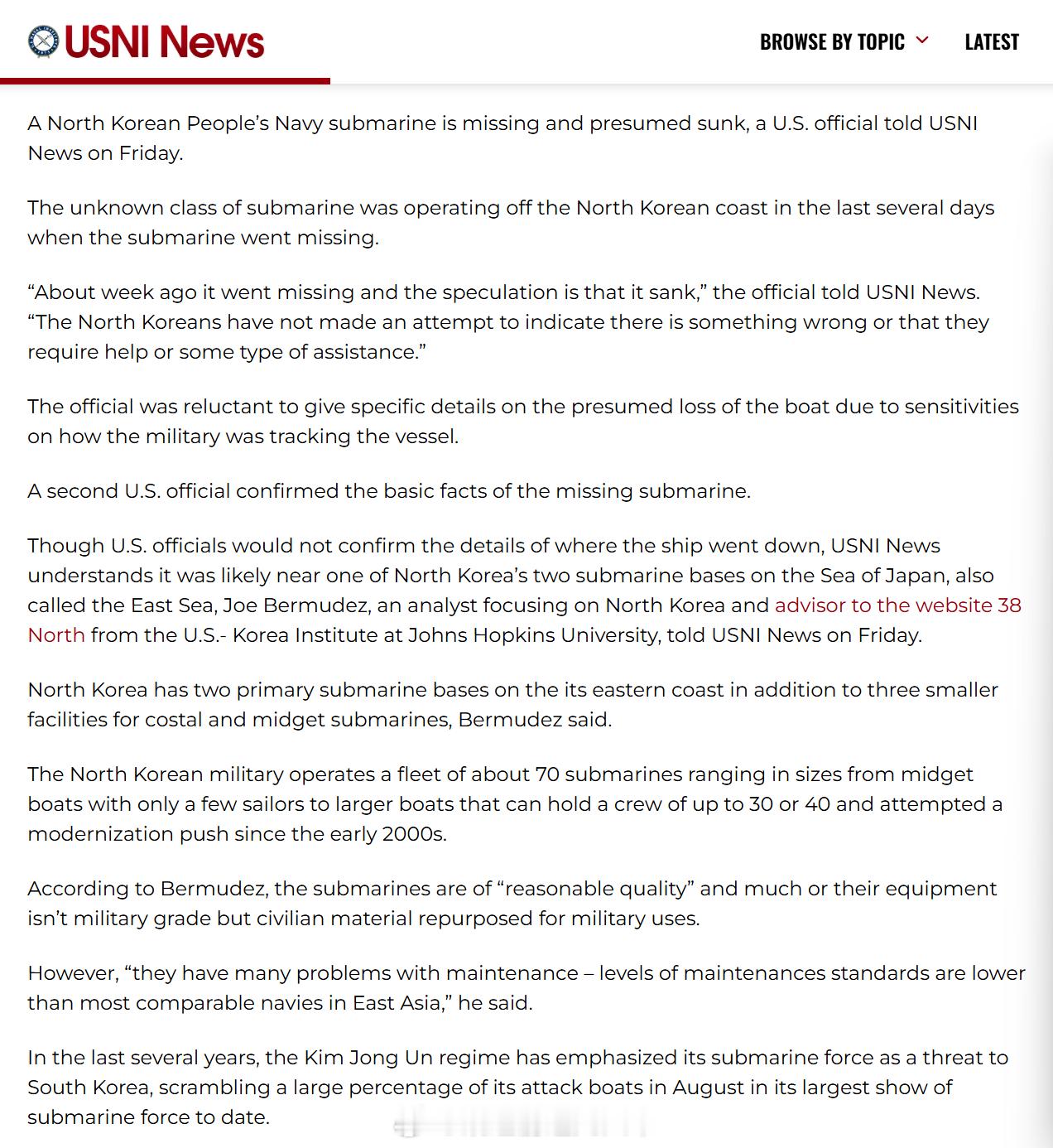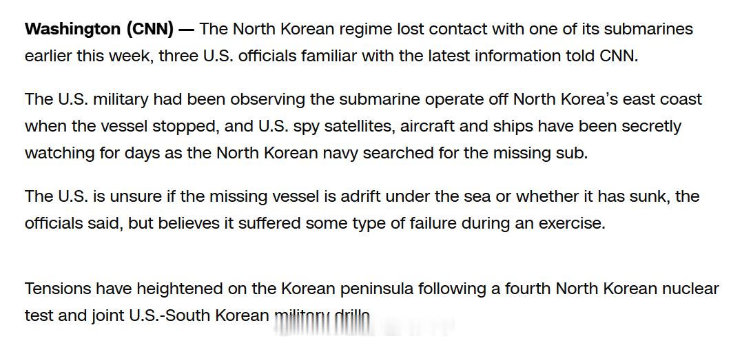 据美国海军学院等美媒2016年3月报道,一艘不明型号的朝鲜潜艇在朝鲜东海岸附近活动时失踪,推测已经沉没,朝鲜方面随后展开搜索行动。一位美国官员告诉美国海军学会新闻:“这艘不明型号的潜艇在此前一直在朝鲜海岸附近活动,随后失踪,时间是大约一周前,人们猜测它已经沉没了。朝鲜方面没有试图表明出了什么问题,也没有表示他们需要帮助或某种形式的援助。”美国媒体的报道称,美军当时一直在观察该潜艇在朝鲜东海岸的活动,直到“该艇活动停止”。美军的间谍卫星、飞机和舰船在随后数天内监视了朝鲜海军搜寻该潜艇的活动。美国官员们表示,美国方面不确定这艘失踪潜艇的状态,但相信该艇可能在活动中发生了某种故障。烽火问鼎计划每天认识一件兵器向海底出击