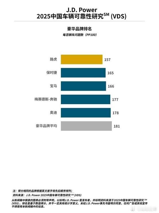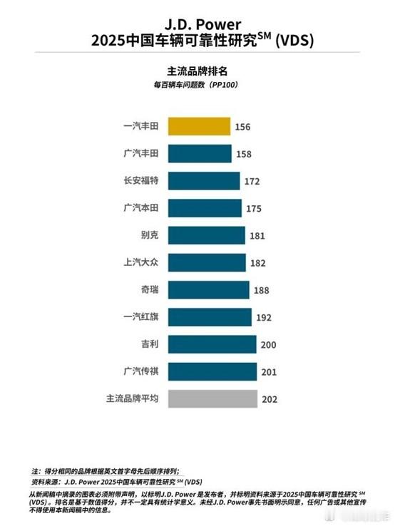 2025中国汽车质量榜:合资强势,国产仅4家在榜,设计缺陷为主年底买车,别再只看颜值和配置了!最近的汽车圈可是暗流涌动——这边国家市场监督管理总局的召回公告接二连三,那边权威研究报告直接给行业长期质量亮了“黄牌”。对消费者来说,一辆车开几年后会不会变成“修车厂常客”,恐怕比它刚到手时有多炫酷更重要。J.D. Power最新发布的2025年中国车辆可靠性研究,就像给市场做了一次“全面体检”。这份基于近2.3万名真实车主反馈的报告,专门盯着用车13到48个月内的“糟心事”。结果有点扎心:行业平均每百辆车问题数高达197个,比去年还多。看来,这届汽车的质量“耐力赛”,成绩不太理想。具体到品牌较量,格局有点意思。主流品牌阵营里,一汽丰田和广汽丰田这对“日系双子星”依旧稳居前列,展现出了传统的耐用性功底。长安福特的跻身前三,算是美系品牌的一个亮点。广汽本田、别克等组成了实力不俗的第二梯队。但报告也无情指出,一些挂着传统合资光环的品牌,这次只混了个中游排名。看来,老招牌不一定等于高质量的“免检金牌”。今年最大的看点,无疑是自主品牌的强势突围。在自主品牌细分排名中,奇瑞拔得头筹,一汽红旗和吉利紧随其后。广汽传祺也成功“上岸”,进入可靠性达标名单。它们质量都已经高于平均水平,能正面和主流合资品牌掰手腕,彻底改写了过去的市场格局。豪华车领域的结果,则足以让不少人大跌眼镜。榜首竟是路虎,这恐怕要刷新很多人的认知。保时捷和宝马分列二、三位。而像奔驰、奥迪这样的德系传统豪强,这次只是勉强跑赢了平均线。虽然豪华品牌整体的问题数依然少于主流品牌,但这份排名本身,就充满了话题性。这份榜单真正值得我们警惕的,不是排名上的“轮流坐庄”。而是报告尖锐地指出,设计类缺陷已经取代制造故障,成为长期质量的头号“杀手”。与三年前相比,这类“胎里带”的问题暴增了20%。这意味着,很多毛病在图纸阶段就埋下了根,后期再精良的工艺也难以弥补。在智能化功能“闭眼冲”和传统工艺“拼命省”的双重夹击下,整车质量的根基正在松动。更让人后背发凉的是,质量恶化的速度在加快。研究发现,对于那些才开了1-2年的“准新车”,其长期质量问题数已经开始抬头。其中,信息娱乐系统和座椅是重灾区,今天的新潮配置,很可能就是明天的烦恼源头。车辆的核心耐久性优势,正在被快速侵蚀,这对所有车企都是一记响亮的警钟。写在最后面对这场系统性的质量危机,不同阵营的车企其实都坐在火山口上。数据显示,所有品牌的设计类问题都在飙升,其中自主品牌和豪华品牌的增幅相对明显。这也揭示了一个行业通病——在“研发验证体系不完善”和“降本压力激增”的左右互搏下,质量防线正在承受巨大压力。激烈的竞争之下,会不会一些车企已经忘记了造车的初心?