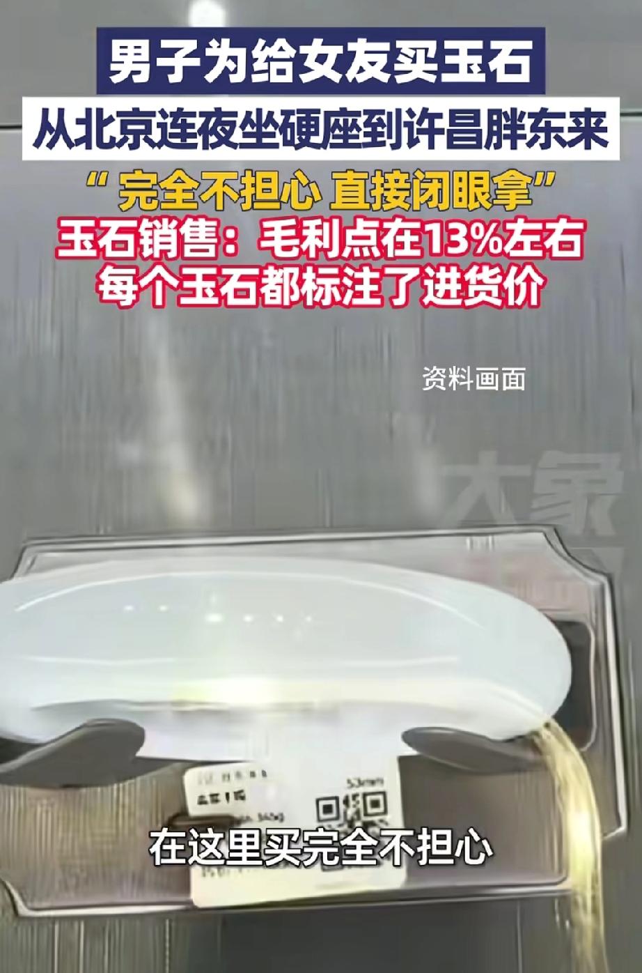 这就是口碑!北京一男子想要给女友买玉石,可自己又不太懂,怕被骗,于是干脆选择连夜坐火车硬座到许昌胖东来,而之所以大老远跑到外地去买玉石,他给出的原因很简单:完全不担心,可以闭眼拿 视频里,男子从北京连夜坐硬座赶来,就为了给女友买玉石。他说“在手机上没约到,就只能跑现场约了”,还直言“在这里买完全不担心,直接闭眼拿就行,质量和价格方面都很有保障”。 在胖东来的玉石柜台,你会发现一个在其他地方很少见的现象:每一块玉石旁边,不仅标有售价,还会清清楚楚地标明这块玉石的“进货价”。商场的工作人员介绍,他们玉石的毛利率大概就控制在13%左右。 这意味着什么? 意味着商场把成本和利润都明明白白摊开来给你看,挣的是公开、合理的辛苦钱,绝不靠虚高标价和以次充好来牟取暴利。 正是这种极致的透明和诚信,让那位小伙子觉得,哪怕跨越千里,这笔消费也值得、安心。 有人狂赞“全国唯一可以闭着眼拿商品的商场,不担心是假的”,“不卖假货,就是成功秘诀。这算不算一种悲哀”。 “不卖假货”本应是商家经营最基本的底线,是法律的最起码要求。什么时候开始,它竟然稀罕到可以成为一家企业击败全国同行的“秘诀”和“核心竞争力”了?这难道不是一种巨大的讽刺吗? 我们为胖东来叫好,其实也是在为一种本该常态、如今却成“清流”的商业环境感到一丝心酸和悲哀。我们的感动,本质上是对诚信稀缺的一种无奈共鸣。 最高的商道,或许就是回归本分。消费者的心其实很简单,也最聪明。当“不欺客”成为常态而非新闻时,那才是我们真正期待的商业文明。希望胖东来这束光,能照亮更远的地方。 男子为给女友买玉石坐硬座到胖东来 胖东来珠宝