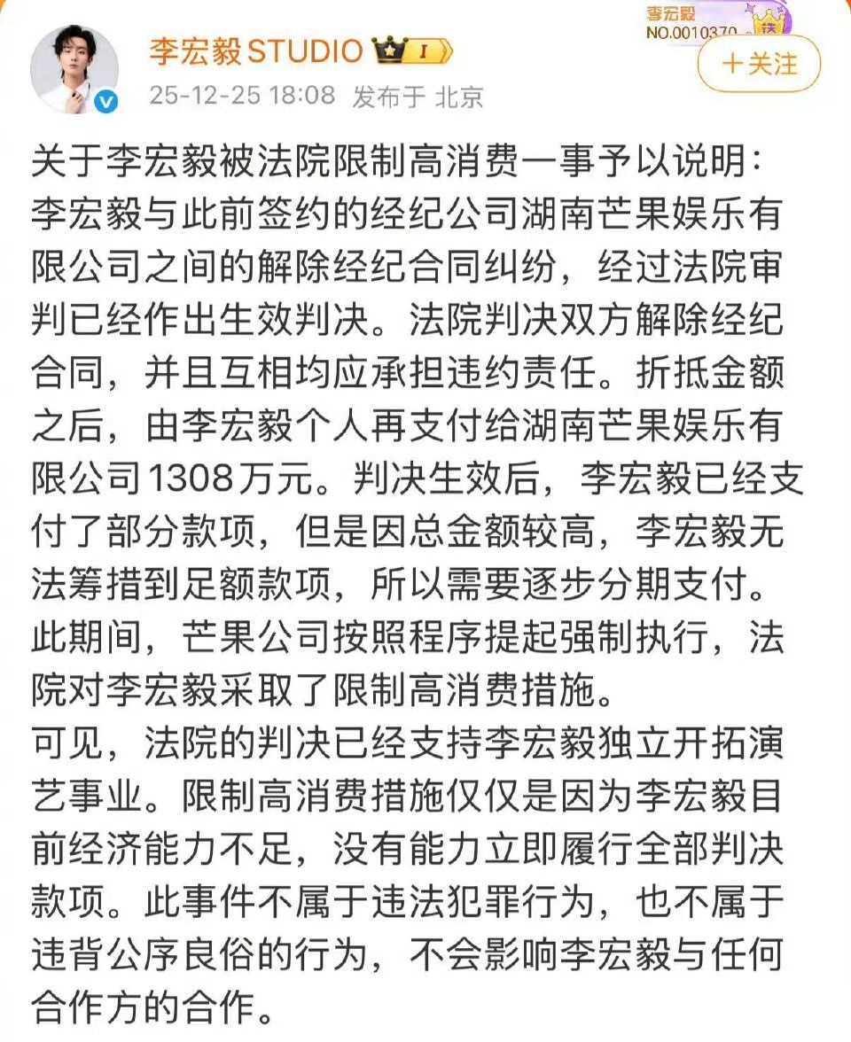李宏毅限高李宏毅今天被法院发布限高,粉丝澄清是李宏毅未成年人时家人签了芒果,演
