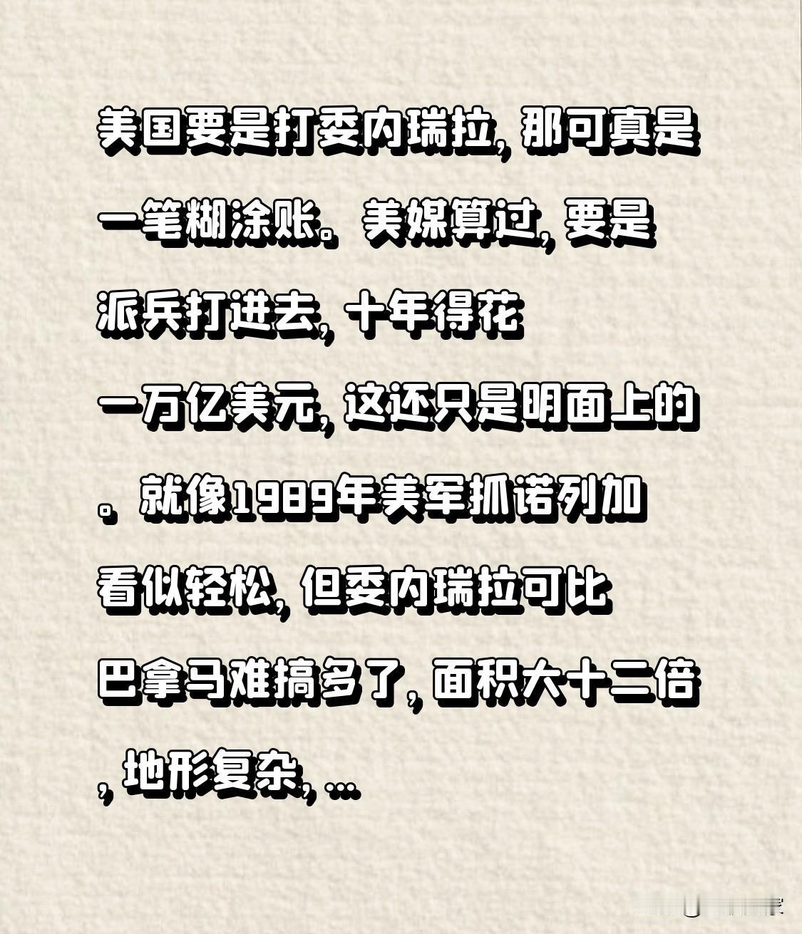 美国要是打委内瑞拉,那可真是一笔糊涂账。美媒算过,要是派兵打进去,十年得花一万亿美元,这还只是明面上的。就像1989年美军抓诺列加看似轻松,但委内瑞拉可比巴拿马难搞多了,面积大十二倍,地形复杂,得十五万地面部队,可美军能动用的战斗人员还凑不够五万。 而且财政方面,美国国债超三十八万亿,再投一万亿,债券市场得崩溃,美元地位也会受影响,油价上涨还会让美国家庭多花油钱。拉美邻居们也不乐意美国动武。 美国真要打委内瑞拉,这代价谁也说不准会多大。你觉得美国会为这冒险吗?这场潜在的战局会如何发展?美国若真动手能承担得起后果吗? 委内瑞拉战局 委内瑞拉的困境 委瑞瑞拉局势 南美委内瑞拉 委内瑞拉石油战 委内瑞拉的困境 委瑞瑞拉局势 南美委内瑞拉 委内瑞拉石油战 阿根廷委内瑞拉 美陈兵委内瑞拉 智利委内瑞拉