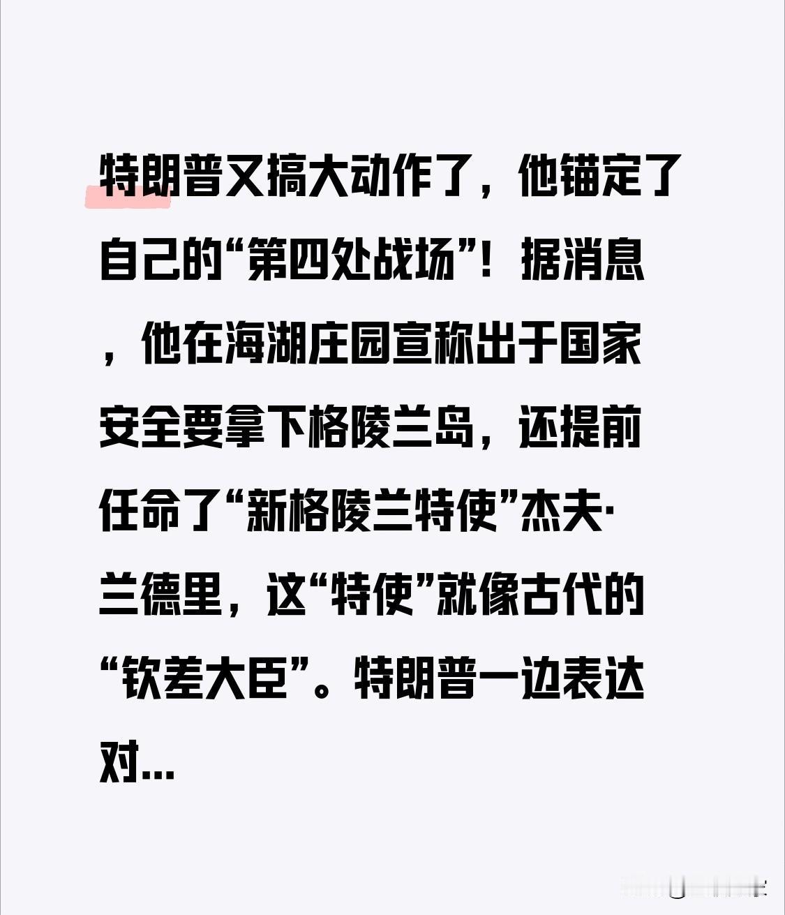 特朗普又搞大动作了,他锚定了自己的“第四处战场”!据消息,他在海湖庄园宣称出于国家安全要拿下格陵兰岛,还提前任命了“新格陵兰特使”杰夫·兰德里,这“特使”就像古代的“钦差大臣”。特朗普一边表达对格陵兰岛的渴望,一边拿中国当幌子,说海岸附近有中俄船只,可这也没法让美国非法占领变得合法。丹麦第一时间抗议,格陵兰岛也强调自己决定未来。 特朗普这波操作能成功吗?“特使”兰德里又会起到啥作用?大家觉得美国这次能如愿吞下格陵兰岛吗? 聊特朗普 特朗普发难 欧洲对特朗普 特朗普争议发言 聊特朗普 欧洲对特朗普 特朗普外交突袭 特朗普碰壁 特朗普表 特朗普外访 特特朗普