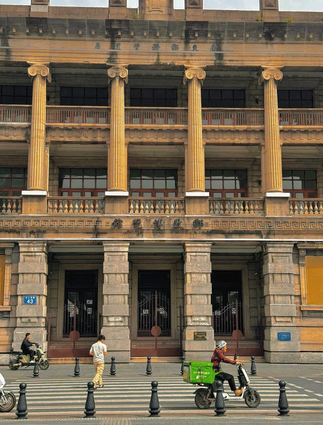 骑楼风情融合欧美摩天楼设计,是广州标志性建筑。外墙雕刻精美,窗户和门廊的设计充满复古感,楼下斑马线处可以仰拍人与建筑全貌