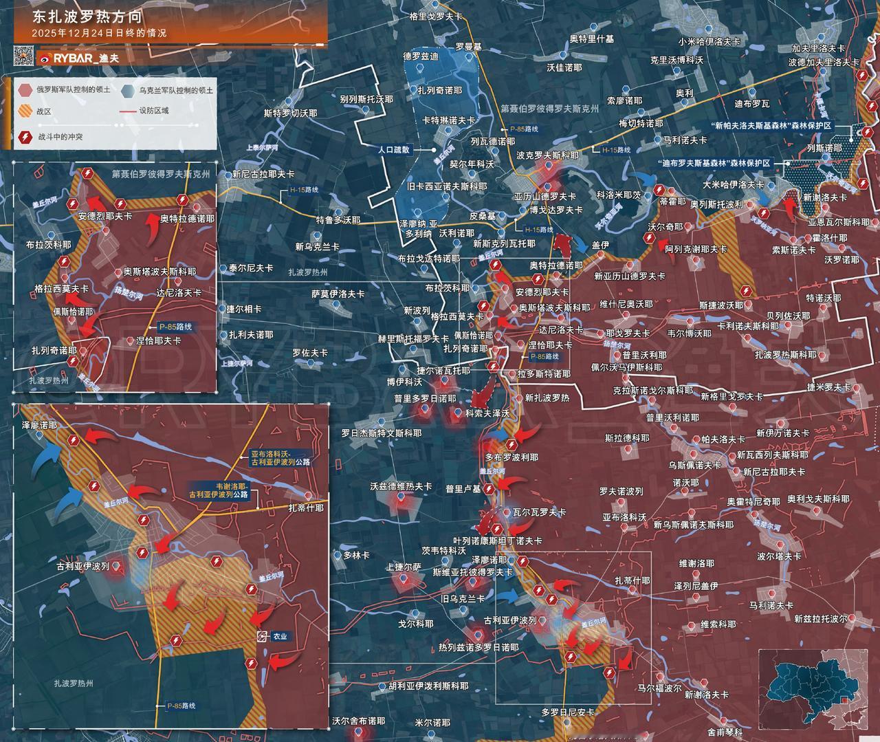 🚩东扎波罗热方向 2025年12月24日日终的情况 俄军在盖丘尔河左岸的桥头阵地还在继续扩大。俄罗斯第29“东方”集团军的第36摩托化步兵旅控制了位于扎波罗热州和第聂伯罗彼得罗夫斯克州交界处的扎列奇诺耶居民点。 该地区是俄军在清理安德烈耶夫卡和格拉西莫夫卡的敌军后取得的延续性胜利,取得该地将使俄军能从而在盖丘尔河以西形成新的、稳固的桥头阵地。 此外,此地的成功在一定程度上抵消了敌军近日在多布罗波利耶地区取得的反攻的成果。乌军利用河流以西的高地并以小股部队不停的袭扰俄军。 📌与此同时,古利亚伊波列周边的局势正逐渐紧张。该城市的争夺战已进入决定性阶段:乌军已向该地段调集了大部分有战斗力的突击部队,这不仅凸显了该地对敌方指挥部的象征意义,也表明了其战术价值。 ❗夺取古利亚伊波列将能大幅扩大盖丘尔河对岸的桥头阵地,并腾出力量用于进一步进攻扎波罗热州北部,以及迂回奥列霍夫筑垒地域。 俄乌冲突新局势俄军最新进展热点观点 来源:RYBAR_渔夫