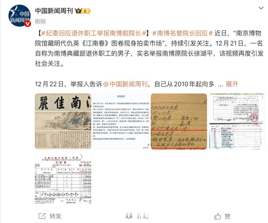 徐湖平终于不装哑巴了! 面对郭礼典那实打实的实名举报,这位前院长憋了半天,就憋出一句:“会在合适的时机回应。” 这事闹到现在这个地步,导火索是一幅叫《江南春》的古画,1959年,收藏世家庞莱臣的后人庞增和带着一腔赤诚,将137件“虚斋旧藏古画”无偿捐给了南京博物院,其中就包括明代画家仇英的《江南春》图卷,这些画作都是庞家几代人精心呵护的珍品,捐赠时满心期待它们能被妥善保管、供世人瞻仰。 谁也没想到,时隔66年后的2025年5月,这幅《江南春》竟出现在北京一家拍卖行的预展上,估价直接飙到了8800万元,庞家后人才猛然意识到,当年捐赠的137件画作里,有5件早已不翼而飞,《江南春》正是其中之一。 带着满心疑惑,庞家后人找到南京博物院讨要说法,得到的回应却轻描淡写,称这5幅画经鉴定是“伪作”,早已按规定做了“划拨调剂”处理。 可这个说法根本站不住脚,举报者郭礼典的出现更是让事件的疑点浮出水面,郭礼典不是普通的举报人,他在南京博物院工作了42年,2016年退休前是专业技术馆员,更是鉴定过逾万件文物的资深专家,这样的身份让他的举报绝非空穴来风。 他直接晒出了关键证据,1997年那份批准划拨的单据上,清清楚楚签着当时南博负责人徐湖平的名字,而徐湖平当时身兼两职,既是南博的副院长,还担任着江苏省文物总店的法人,左手掌握着文物划拨的审批权,右手掌控着文物销售的渠道,这种双重身份让整个流程充满了操作空间。 更让人不解的是,南京博物院出示的2001年销售底单显示,这幅被认定为“伪作”的《江南春》以6800元的价格被一位“顾客”买走,可根据后续调查,这幅画实际在1997年划拨的第二天就被南京收藏家陆挺以16万元买下,所谓的2001年发票要么是补开的,要么根本不是同一幅画。 这幅画的流转路径更是耐人寻味,陆挺后来将画抵押给南京十足斋,无力赎回后画作归了斋主,接着又以5000万元的价格卖给了宁波商人朱光,最终由朱光送拍,从6800元到8800万的估价,短短二十多年价格翻了一万多倍,背后的利益链条清晰可见。 更有意思的是徐湖平的回应,面对铺天盖地的质疑,82岁的他先是说自己不是书画鉴定家、这事没经他手,又说身体抱恙在家多年不过问外界事,可1997年的划拨单据上的签名却铁证如山,直到被追问得没办法,才憋出一句“会在合适的时机回应”。 而南京博物院所谓的“伪作”鉴定也充满漏洞,1961年和1964年的两次鉴定中,第二次参与鉴定的徐沄秋根本没有文物鉴定资质,这样的鉴定结果本身就缺乏说服力。 更让人难以接受的是,类似的情况并非个例,南博曾将北宋赵光辅的《双马图》也判为“伪作”,结果2014年这幅画拍出230万元,画上庞家的鉴藏印清晰可辨,根本无法否认其真品身份。 按照相关规定,接受捐赠的文物处置时应当事先征得捐赠人同意,可庞家后人六十多年来对此一无所知,直到画作出现在拍卖场才知晓真相,南博的做法不仅违背了捐赠人的信任,也不符合后来出台的《国有馆藏文物退出管理暂行办法》。 随着事件发酵,2025年12月23日,徐湖平夫妇被工作组从家中带走调查,第二天,举报者郭礼典被接到江苏省委招待所接受问询,国家文物局和江苏省委省政府也已成立联合调查组介入。 这场风波早已不是一幅画的真伪之争,而是关乎国有文物保护、公共文化机构公信力的大事。 庞家当年无偿捐赠国宝,是出于对国家的信任,故宫南迁文物历经战火得以保存,更是无数人的心血,可在徐湖平执掌南博的25年里,竟有人敢私自撕毁抗战时期的文物库房封条,将馆藏文物鉴定为“伪作”后低价转手,再通过关联公司高价拍卖牟利。 公共文化机构本应是文物的守护者,可个别管理者却利用职务之便将其变成了牟利工具,鉴定流程的不规范、处置过程的不透明,让捐赠人的善意被辜负,也让公众对文物保护的信心受到冲击。 如今调查组已经介入,相信会把整个事件的来龙去脉查个水落石出,那些流失的文物能否被追回,相关责任人能否被依法追责,不仅是庞家后人的期待,也是所有关注文物保护的人的心声。 文物是不可再生的文化遗产,每一件都承载着历史和记忆,保护它们不仅是法律规定的责任,更是对先辈的尊重,对未来的负责。
