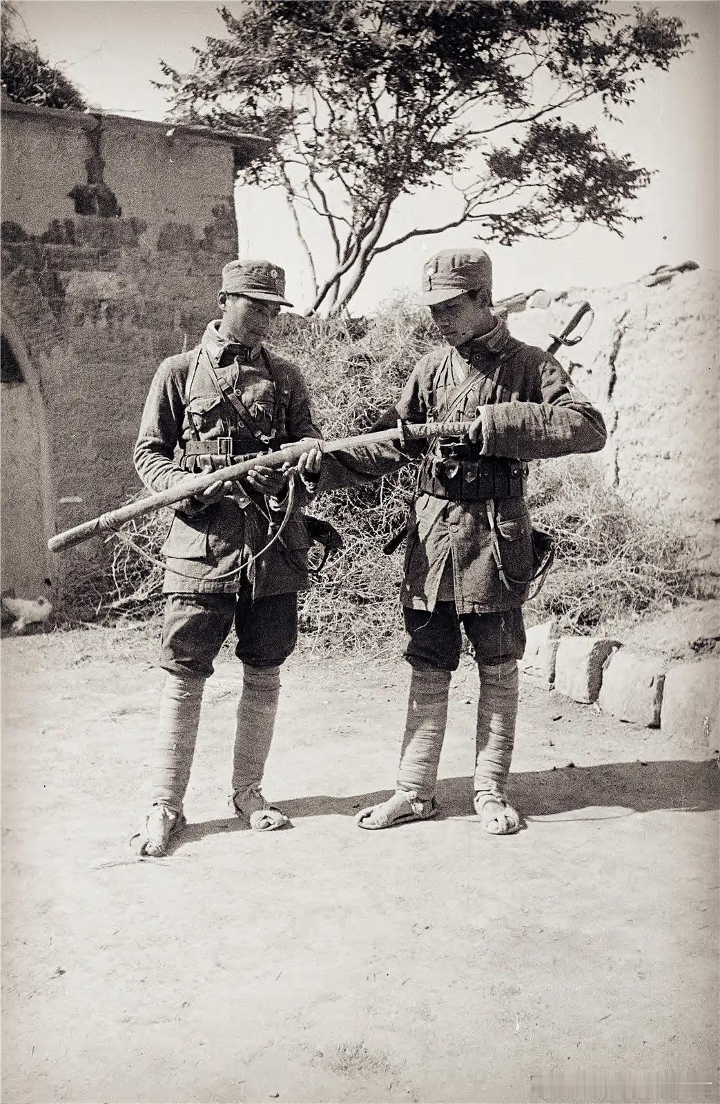 1944年两名八路军战士正在检查缴获的日本军刀,摄影:哈里森·福尔曼