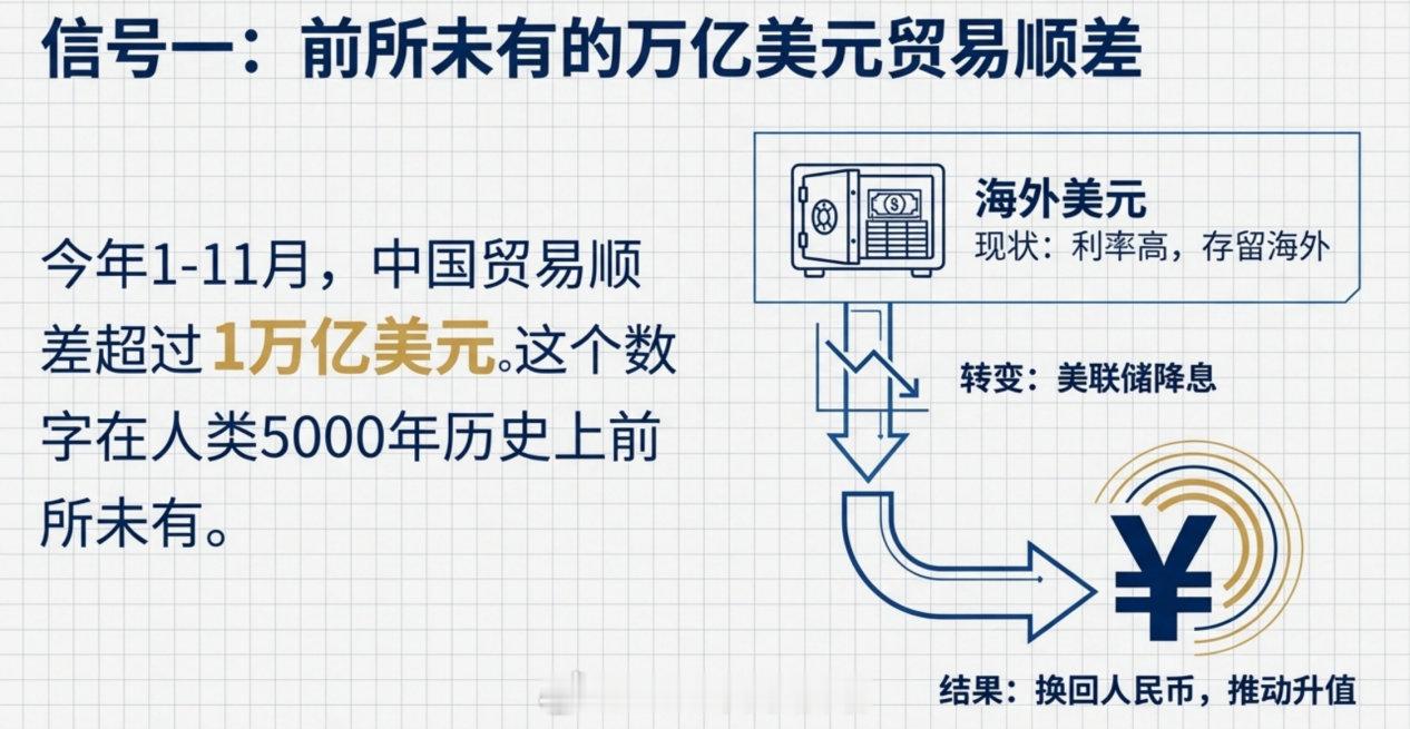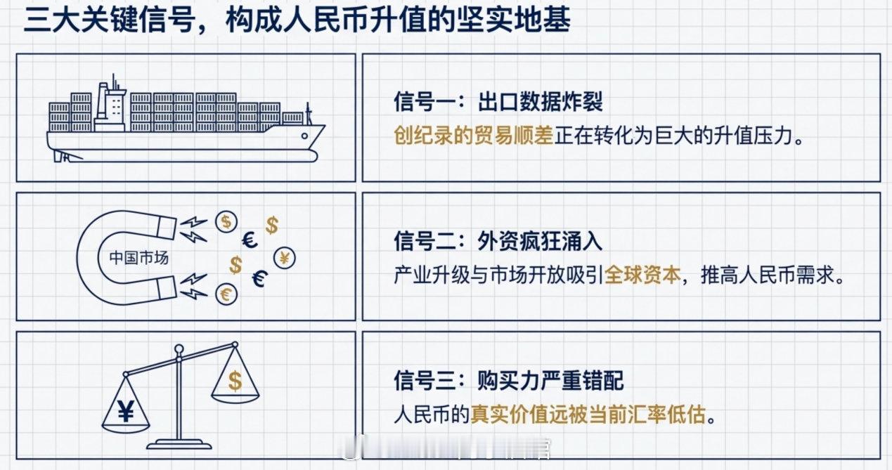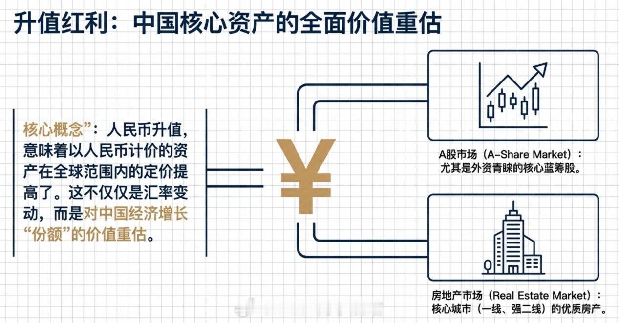 人民币升值箭在弦上,你的资产准备好了吗?说个真相,你的收入很快就要涨了。因为人民币升值,不是会不会的问题,而是什么时候、升多快的问题。未来中国的资产会越来越值钱,不管是股市还是楼市,外资都会蜂拥而至。而这一切都是因为人民币升值的大趋势!为什么这么说?你看三个关键信号:第一个信号,是出口数据炸裂。今年1-11月,中国贸易顺差超过了1万亿美元,这个数字放在人类5000年的历史上都是前所未有,未来能打破的应该也只有中国。而这个数字的背后就是出口商手里攥着大把美元。以前美元利率高,他们愿意把美元存在境外银行吃利息,从国内低息借人民币经营,赚个利差。但现在美联储在快速降息,利差也在快速消失。这意味着什么?意味着他们会把海外的美元拿回国内换成人民币。而大量的美元涌入,人民币自然就会升值。去年9月美联储第一轮降息的时候,这一幕就上演过。第二个信号,是外资正在疯狂涌入。今年前10个月,高技术产业实际使用外资高达1925.2亿元人民币!外资为什么来?因为中国的营商环境在持续优化,海南自贸区封关运行,金融、电信、医疗等高利润行业不断放松外资限制。更关键的是,国家在大力扶持芯片、半导体、人工智能、机器人这些高科技产业。而外资想进来分一杯羹,就必然要把外币换成人民币,那这又是一股推动人民币升值的力量。第三个信号,是购买力的严重错配。现在出过国的人都知道,人民币在国内的购买力远远强于它的汇率。你月薪5000,在国内能吃好穿好住好,出国却发现欧洲人虽然月薪3000欧元,但生活水平却和你差不多。按真实购买力算,人民币对美元的合理汇率应该在3.5:1到2.5:1之间,而不是现在的7:1。这种严重低估,也是人民币升值的根本原因。二、升值红利:中国资产的价值重估那人民币升值会带来什么?一句话:中国核心资产的全面重估。尤其是A股和楼市。先说A股。人民币升值,最直接的受益者是A股,尤其是外资青睐的核心资产。为什么?因为外资买A股,用的是美元换人民币,人民币升值意味着他们既可以赚汇率升值的钱,又能赚股价上涨的钱。去年9月美联储第一轮降息后,北向资金就大举加仓A股。那这次升值预期一旦形成,外资大概率会重演这一幕,再加上现在慢牛的氛围,A股未来可期好吧!再看楼市。人民币升值会让一线城市、强二线城市的优质房产成为硬通货。为什么?因为这些城市的房产本质上是中国经济增长的"份额"。人民币升值,相当于这些份额的全球定价提高了。就像当年日本房地产泡沫时期,东京的房价被疯炒,本质上就是日元升值带来的资产重估。当然,这不意味着所有房子都会涨。那些人口流失、产业空心化的三四线城市,该跌还得跌。但北上广深、杭州、成都这些核心城市的优质地段,在升值预期下会有明显的价值重估。三、不能快升:日韩教训历历在目说到这里,你可能会问:既然升值这么好,为什么不一步到位,直接升到6甚至5?因为快速升值会带来灾难性后果。日本和韩国就是前车之鉴。比如日本在1985到1995年,日元汇率暴涨3倍。表面上看,日本成了发达国家,但代价是什么?低端制造业被彻底摧毁,大量工厂搬到东南亚和中国,底层劳动力失业率激增。更致命的是,日元快速升值刺激了资产泡沫。房价、股价疯涨,而泡沫破裂后日本又陷入了"失落的三十年",至今没完全缓过来。韩国也差不多,2002-2007年,韩元升值推动韩国企业海外扩张,三星、现代、LG这些巨头赚得盆满钵满。但同样的,低端制造业大量外迁,底层就业出现问题,韩国成为东亚最卷的国家,没有之一。中国的情况更复杂。我们有全产业链覆盖,从打火机、螺丝钉到汽车、芯片,低中高端全都有。这是优势,但也是制约。因为低端制造业虽然利润薄,但解决了几千万人的就业。快速升值意味着什么?意味着这些对汇率敏感的低端制造业会瞬间失去竞争力,几千万人的就业岗位会消失。这不是危言耸听。中国很多制造业企业是卡着利润线在经营的,汇率升个几个点可能还扛得住,但如果短期内从7块升到5块甚至3.5,这些企业要么倒闭,要么搬到东南亚。那几千万靠这些工厂吃饭的工人怎么办?我们的就业压力本来就不小,不能让快速升值变成失业炸弹。而且别忘了,中国对海外资产的管理能力、维权能力还不够强。安世半导体等一系列案例证明,咱们对海外投资的保护能力还远远不足。如果人民币快速升值,大量企业跑出去投资,结果被坑了、被骗了,那不是肥羊送上门吗?所以,人民币不能快升值,必须慢升值。四、慢升值:最符合中国国情的路径那什么叫慢升值?就是人民币的升值速度差不多只有美元指数跌幅的一半。美元跌得快,人民币跟着涨,但涨得慢一点,给出口企业留出调整时间。但大趋势是不变的,人民币会冲破7元关口,重回6元时代。慢升值的好处是什么?第一,保住就业。低端制造业有时间转型升级或有序往内地迁移,不会造成大规模失业。第二,保住出口。升值幅度控制在合理范围内,科技产品的出口竞争力不受影响,甚至因为成本下降反而更强。第三,吸引外资。升值预期形成后,外资会持续流入,给中国带来大量的就业岗位。第四,提升购买力。虽然升值慢,但长期看老百姓出国旅游、购买进口商品会越来越便宜,生活水平实实在在的提高。五、写在最后:抓住价值回归的窗口人民币升值,本质上是中华民族伟大复兴的一环