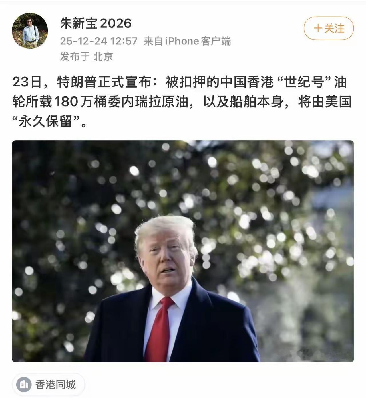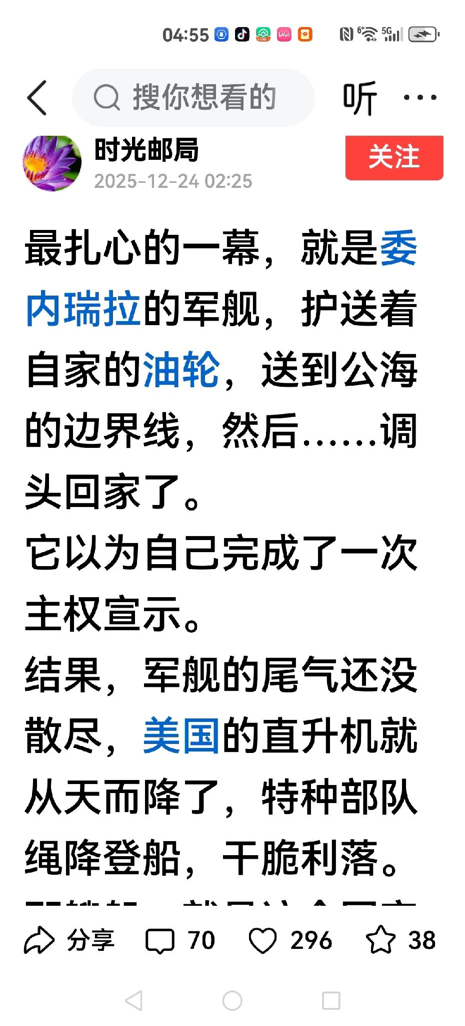 【紧急呼叫张维为】 委内瑞拉军舰护送油轮,刚到公海就调头回去了,殊不知真正需要保护就是公海啊。 更可气就是直升机在油轮甲板上,空降全部武装的美国大兵,直接扣押油轮,特朗普宣称“永久保留”? 此刻“占浪”在哪里? 紧急呼叫张维为,他说过“明天就不是超级大国”的铮铮誓言? 怎么办?怎么办?