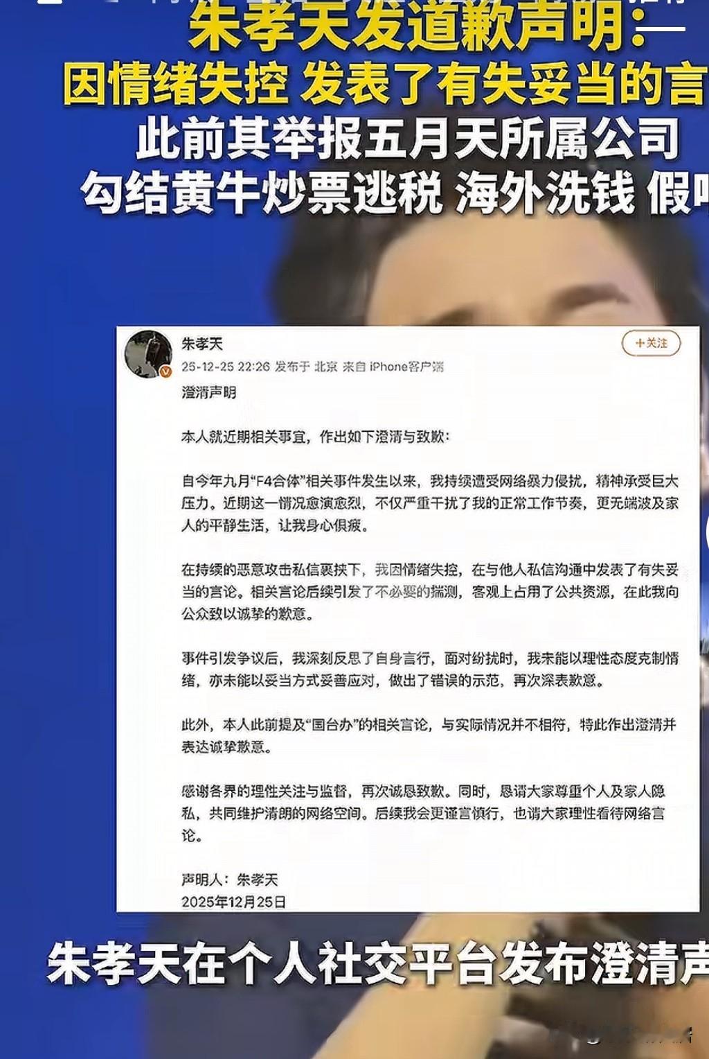 朱孝天道歉了! 估计是得罪大佬了,终究是小胳膊拧不过粗大腿啊,人家要是没有强大的背景也不敢这么干啊,有人说估计爆料是真的,只是阿信的后台更硬,这下完了😰,娱乐圈谁还敢找他,早上发的,晚上就致歉,你说这可信度让网友捏把汗啊,我青春里的F4终究是回不去了!