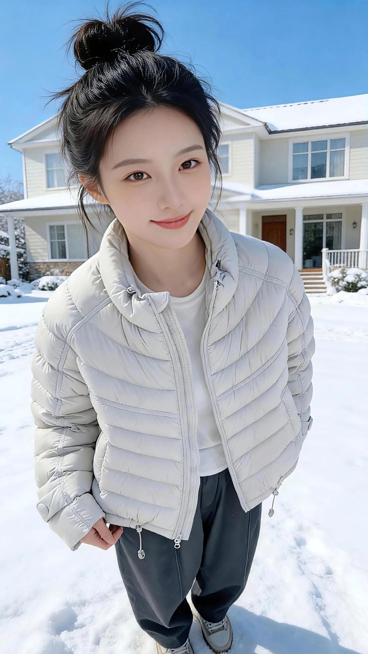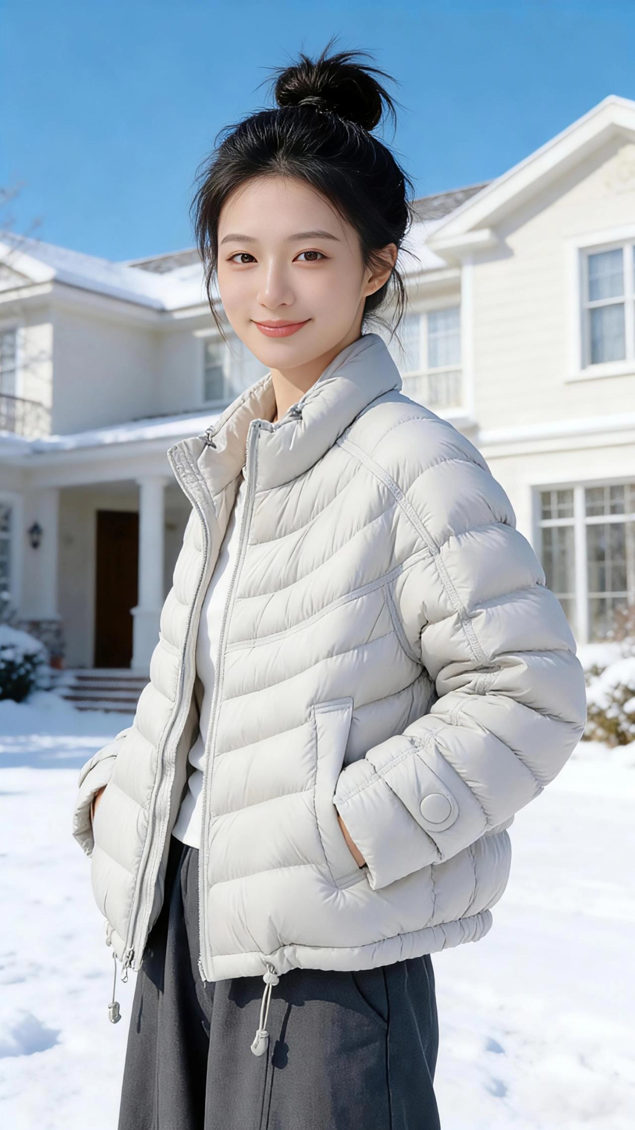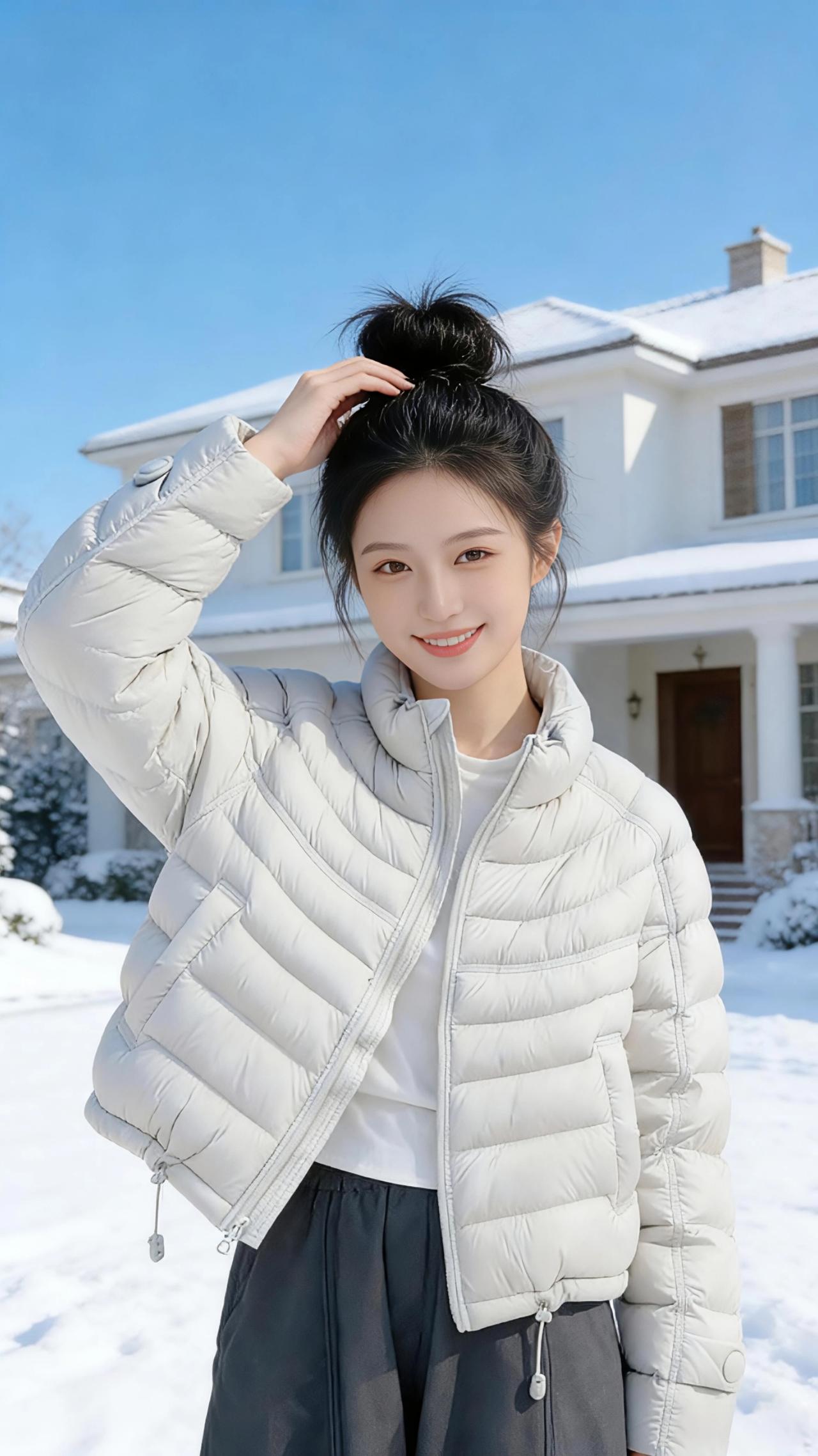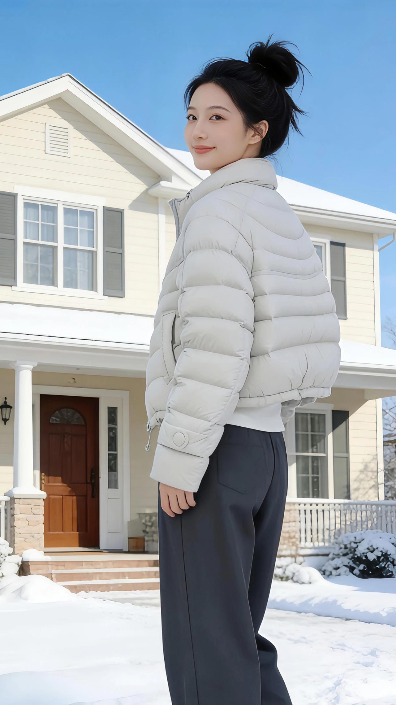 雪日里的轻暖 冬日的阳光揉碎在澄澈的蓝天上,落进覆雪的庭院时,便添了几分温柔的温度。 她立在雪色里,浅灰色的轻薄羽绒服裹着一身轻盈,像拢住了冬日里一缕软乎乎的云。蓬松的丸子头俏皮地翘着,几缕碎发被风拂得轻扬,衬得冷白的脸颊愈发明亮。手插在衣兜的模样随性又慵懒,抬手轻拢发髻时,唇角弯起的笑意,比雪地上的阳光还要暖几分。 身后的独栋小屋覆着薄雪,原木色的门廊、奶白色的墙面,在蓝天白雪的映衬下,成了最温柔的背景。她转身后的侧影,羽绒服的菱格纹路在光线下漾着细腻的光泽,与脚下未被踩实的雪粒相映,似是将冬日的清冷与人间的暖意,都揉进了这一方小小的天地里。 雪是静的,风是软的,她站在那里,就像冬日里忽然绽开的一抹甜,让凛冽的季节,也多了数不尽的温揉与生动高级感穿搭 时尚穿搭 小个子穿搭 羽绒服