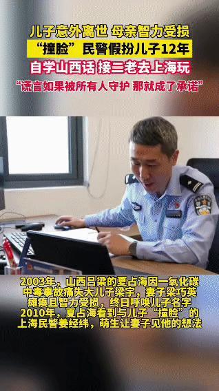 2003年,山西吕梁的夏占海夫妇遭遇重创,大儿子梁宇因一氧化碳中毒意外离世,妻子梁巧英更是因此瘫痪且智力受损,整日不停呼唤儿子的名字。 2010年,夏占海偶然看到与儿子长相“撞脸”的上海民警姜经纬,便萌生了让妻子见一见他的想法。 2013年,姜经纬答应了这份特殊的请求,与夫妇相见时,梁巧英激动地将他认作“小宇”,从此姜经纬便开始了长达12年的“扮子”之路。 他自学山西话,定期上门探望,还接二老到上海游玩,刻意隐藏身份线索,用这份温暖的“谎言”,守护着两位老人的精神寄托,让这份善意化作了最动人的承诺。暖心瞬间 正能量