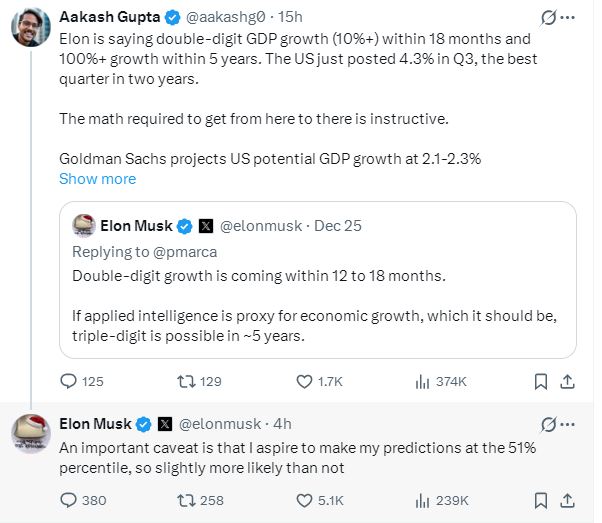 针对马斯克关于AI可能帮助美国经济在五年内实现三位数增长的预测,一位网友分析称,目前华尔街的主流预测是到2030年代初,美国的潜在GDP增长率将达到2%以上,其中人工智能将贡献约0.3个百分点,马斯克的预测要比他们高出50倍。造成这一分歧的原因是,马斯克是在押注功能性AGI将在5年内出现。“华尔街的预测(2%的增长)和马斯克的预测(100%以上的增长)之间的差距,就是‘AI是一个有用的工具’和‘AI自动化了一切’之间的差距。埃隆正在为一个尚不存在的世界定价,他正在积极建设这个世界。但市场并非如此。”马斯克回应称:“需要特别说明的是,我力求将预测结果的准确度控制在51%百分位,所以可能性略大于不可能。”