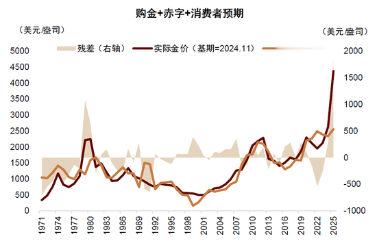 目前黄金上涨至4500美元/盎司附近,已经提前达到我们的长期价格预测。基于当前基本面指标数值,其实黄金价格已经明显高于模型计算的短期估值中枢,可能存在一定泡沫。