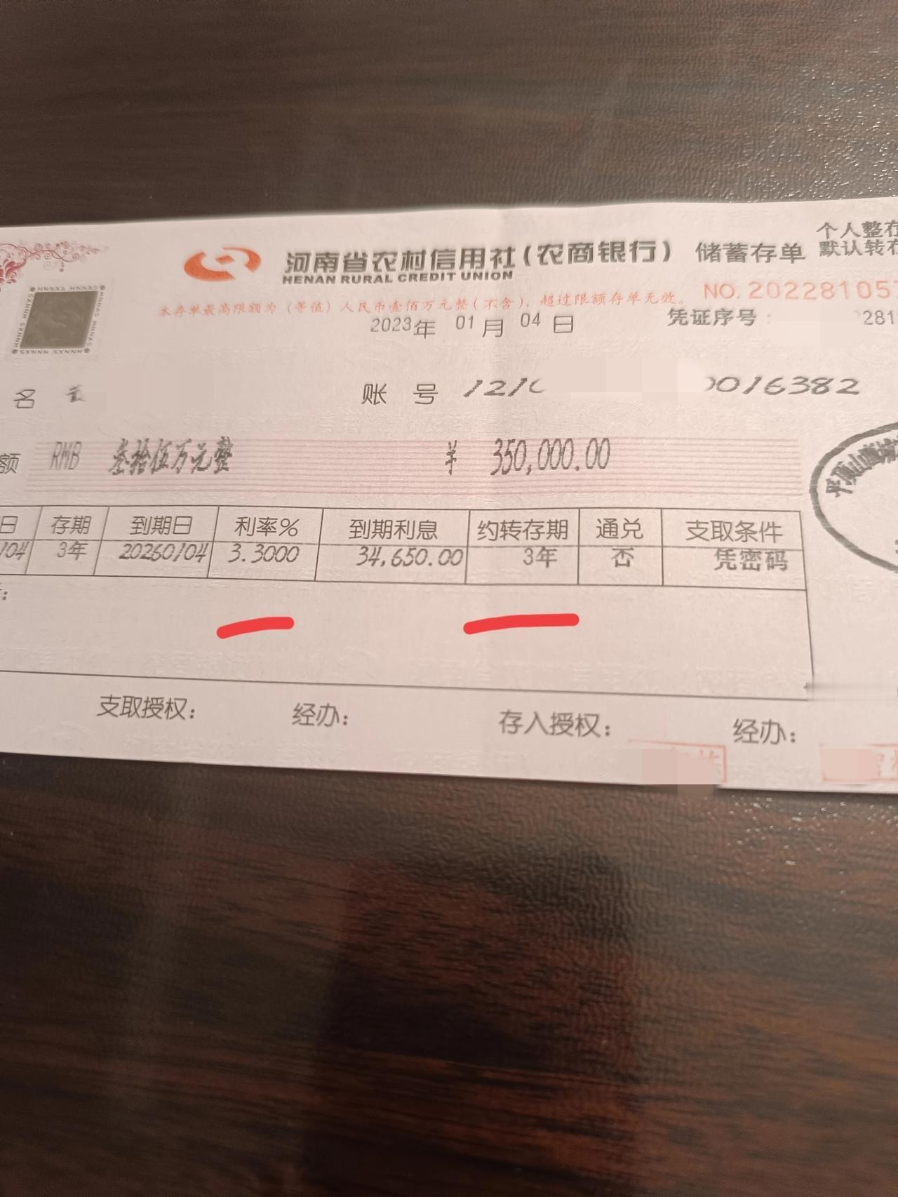 这样存钱真香 三年前存了35万元定期存款,存期为三年,利率为3.3000%,银