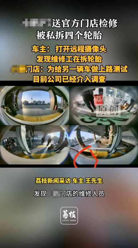 “离了个大谱!”近日,北京,一男子的车出故障后,送去官方门店维修,结果手机突然传来提示:车辆有异常震动!男子好奇的打开摄像头,发现工作人员把他的4个车胎给拆了,而且还是给其他车做测试用的。负责人:愿意赔偿5000元! 现在人们的生活条件越来越好,家家户户都开上了汽车,不过车辆在使用过程中,难免会出现故障,相信很多人都会送去官方门店维修,毕竟这样比较放心,可王先生却因此忧虑起来。 据媒体12月25日的报道,前不久,王先生车子的智能驾驶系统出了故障,他联系了官方门店后,就把车子送去维修了。 可是王先生在家等待的时候,手机却提示车辆发生了震动,担心车子出了意外,王先生便开启了远程摄像头,结果看到有工作人员正蹲在车旁拆卸轮胎! 明明是修理系统的,为什么要拆轮胎呢?王先生十分不解,于是给门店打去电话询问,最终被告知,有辆车要上路测试,工作人员没有找到合适的轮胎,就把他的车胎先拿去用了。 听到这个解释,王先生非常生气,凭什么擅作主张拆自己的轮胎,如果出了事故责任是不是还要自己承担? 最终,王先生要求门店赔偿3万元并更换新的轮胎,可是负责人却觉得王先生有些“狮子大开口”,更换新胎可以,但是只愿赔偿5000元。 网友看后表示,这种店真是太令消费者失望了,人家是出于信任才把车送来维修的,可是却干出这种事情,以后还要不要做生意? 信息来源:《送修车辆竟被私拆四个轮胎 车主远程摄像头发现后投诉 门店回应:为给另一辆车做上路测试目前公司已经介入调查》法治进行时
