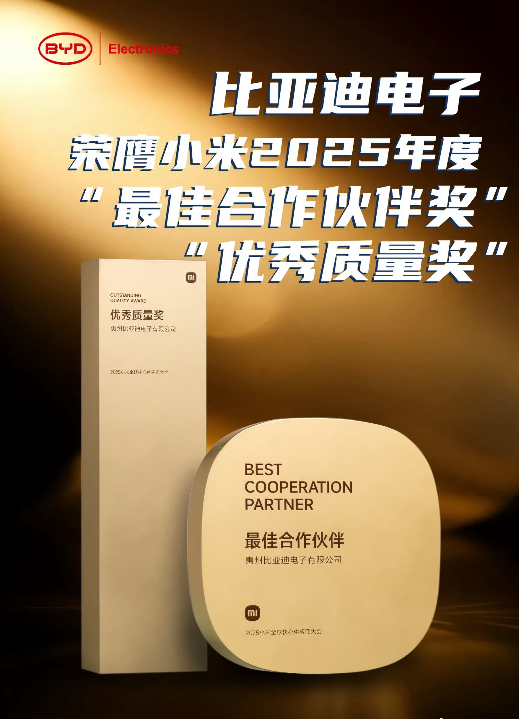比亚迪电子荣膺小米两项年度大奖!2025年度最佳合作伙伴奖、优秀质量奖。