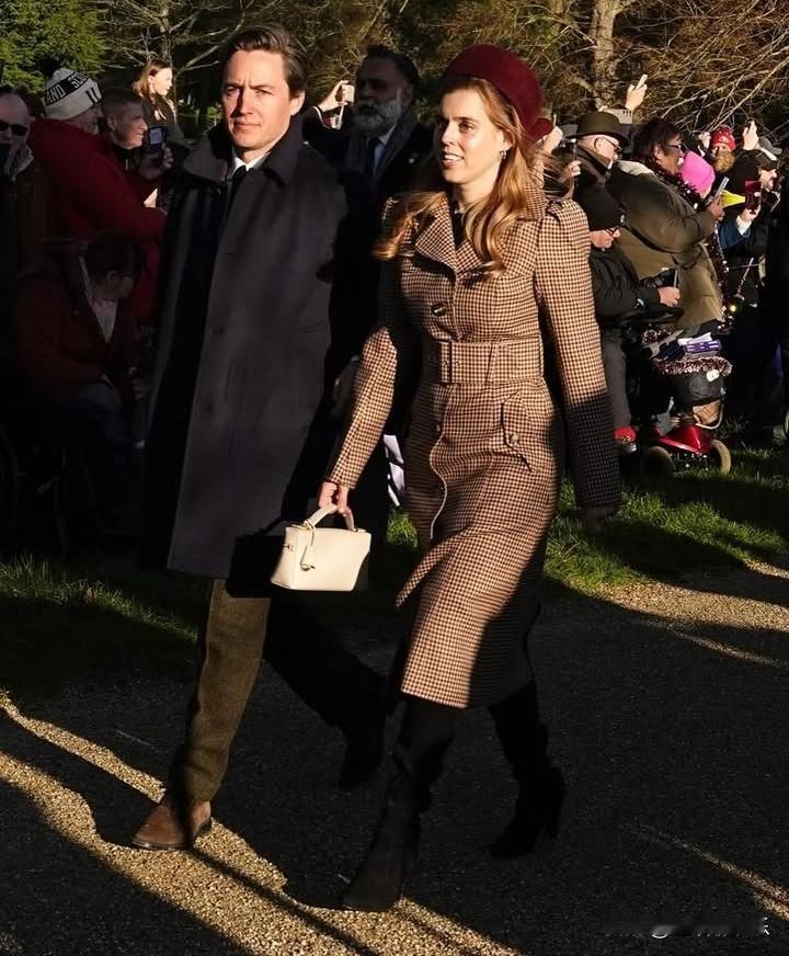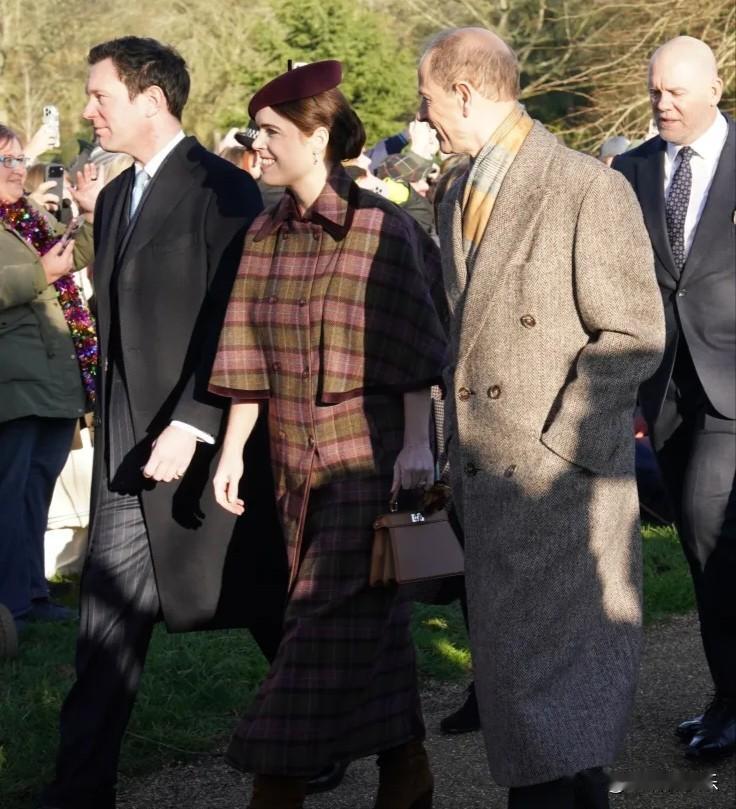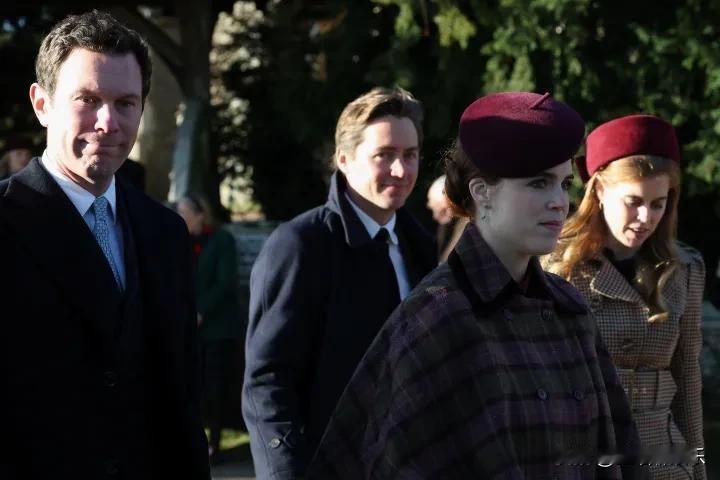 比阿特丽斯公主和妹妹尤金妮与王室成员一起参加圣诞教堂礼拜,他们的父亲安德鲁以及母亲莎拉·弗格森明显缺席。 35岁的尤金妮戴了一顶紫色的帽子,穿着与之相配的外套,而37岁的碧翠丝选择了一件格子大衣,这对姐妹在她们丈夫的陪同下笑逐颜开。